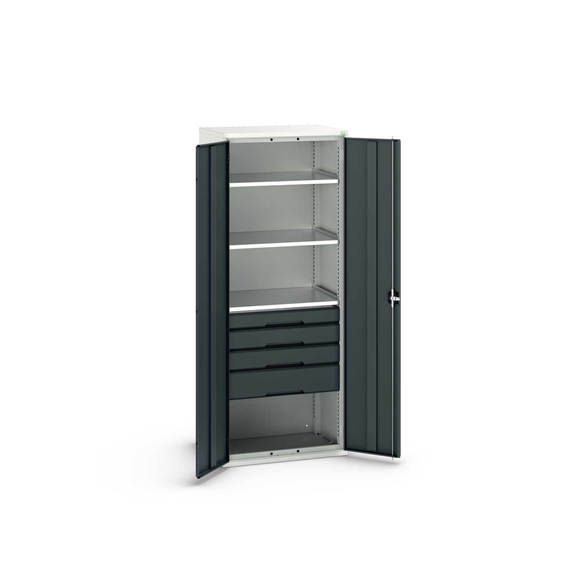 This is 2 Door 4 Drawer Sheet Steel Cupboard 800 x 550 x 2000mm manufactured by Bott. The manufacturer part number is 16926457.19. It contains 2 dedicated doors . The given dimensions of the product include 800 x 550 x 2000mm. The product is made from highly stable and reliable sheet steel. It contains 3 high quality shelves . It includes 4 high-quality drawers . It comes in kitted cupboard configuration.