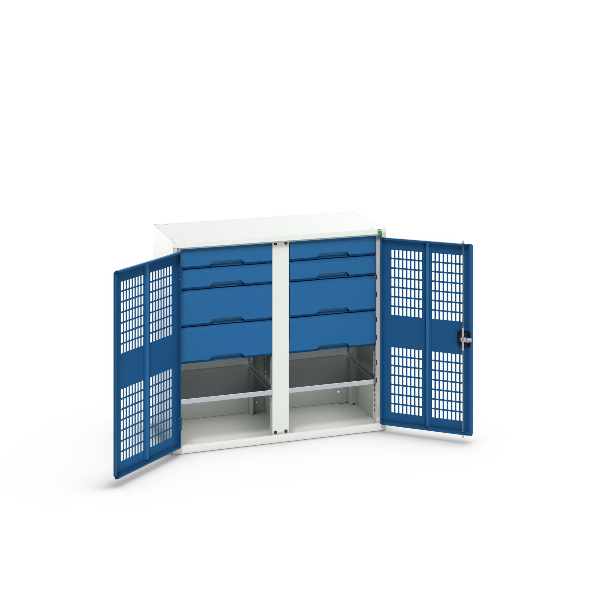 This is 2 Door 8 Drawer Sheet Steel Cupboard 1050 x 550 x 1000mm manufactured by Bott. The manufacturer part number is 16926765.11. It contains 2 dedicated doors . The given dimensions of the product include 1050 x 550 x 1000mm. The product is made from highly stable and reliable sheet steel. It contains 2 high quality shelves . It includes 8 high-quality drawers . It comes in kitted cupboard configuration.