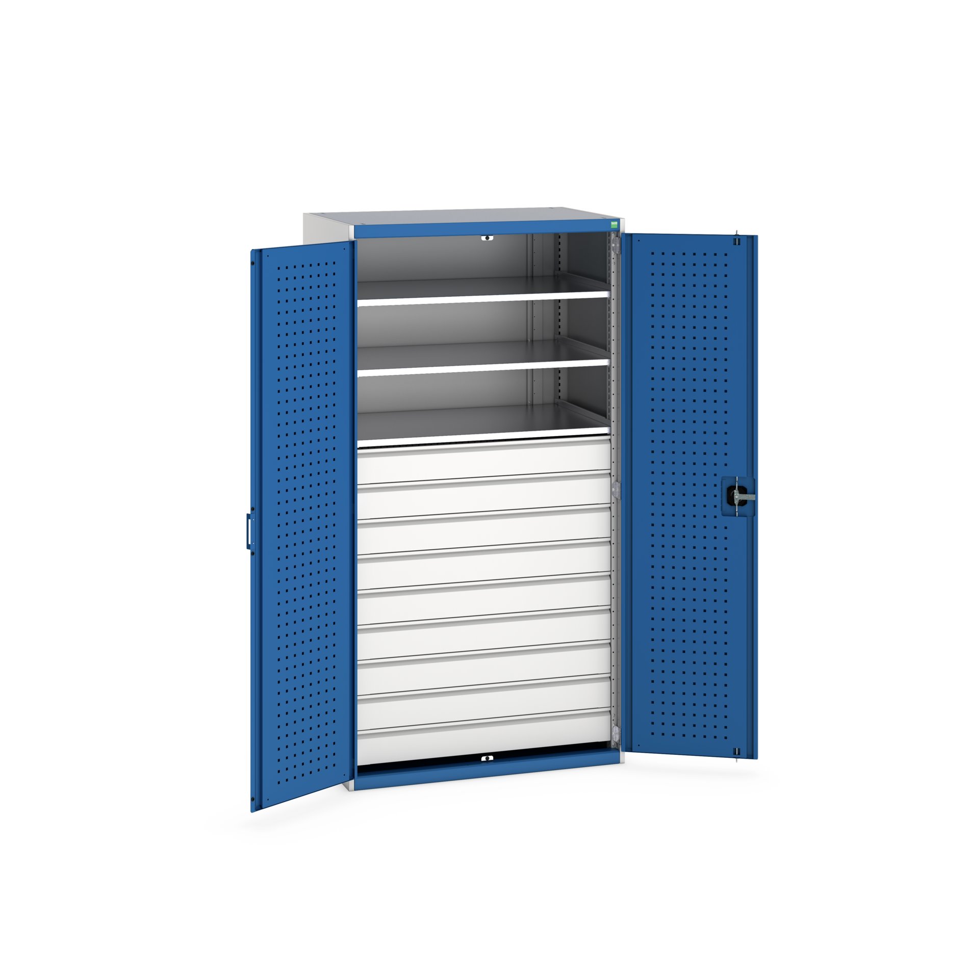 This is 2 Door 9 Drawer Sheet Steel Floor Standing Cupboard 1050 X 650 X 2000mm manufactured by Bott. The manufacturer part number is 40021114.11V. It has a floor standing trait yes . It contains 2 dedicated doors . The given dimensions of the product include 1050 x 650 x 2000mm. The product is made from highly stable and reliable sheet steel. It contains 3 high quality shelves . It includes 9 high-quality drawers . It comes in kitted cupboard configuration.