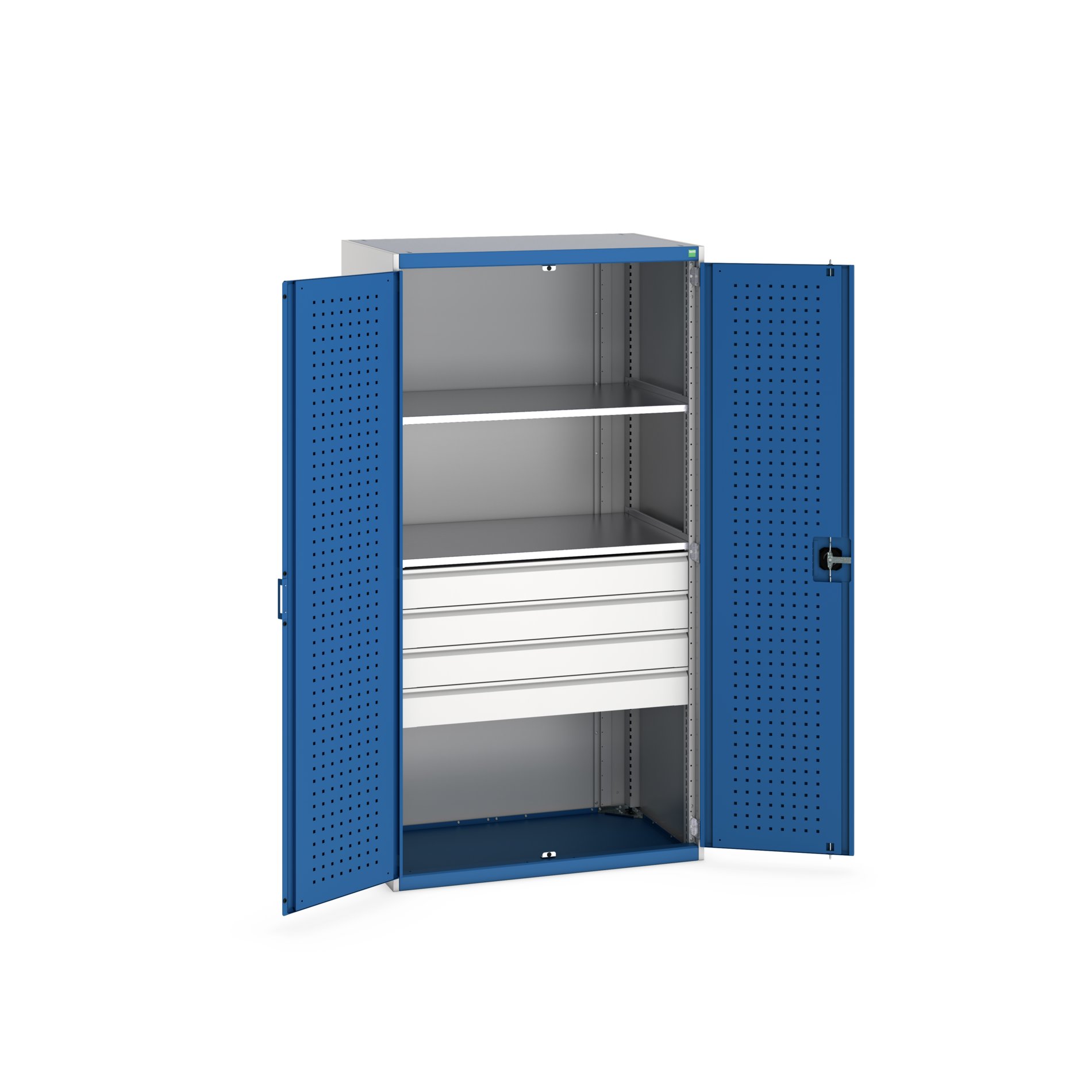 This is 2 Door 4 Drawer Sheet Steel Floor Standing Cupboard 1050 X 650 X 2000mm manufactured by Bott. The manufacturer part number is 40021108.11V. It has a floor standing trait yes . It contains 2 dedicated doors . The given dimensions of the product include 1050 x 650 x 2000mm. The product is made from highly stable and reliable sheet steel. It contains 2 high quality shelves . It includes 4 high-quality drawers . It comes in kitted cupboard configuration.