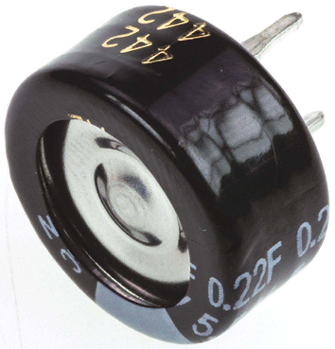 This is 0.22F Supercapacitor EDLC -20 → +80% Tolerance NF Series 5.5V dc Through Hole manufactured by Panasonic. The manufacturer part number is EECF5R5U224. Its diameter is 13.5mm. The product is available in through hole configuration. The given dimensions of the product include 13.5 (dia.) x 7.5mm. Furthermore, the lead has 0.8mm diameter. The product f, is a highly preferred choice for users. Whereas, the minimum operating temperature of the product is -25°c. It is from electric double layer capacitor family . In addition, the height is 7.5mm. It provides a 0.22f of capacitance value. The product comes in 7.5mm depth. It carries a 5.5v dc of voltage. Whereas, the product's diameter is almost 13.5mm . It is assigned with 5 mm of lead spacing. It provides a long-lasting service for a period of 1000h. The lead features 5mm pitch. It has a maximum operating temperature of +70°c. It features -20 → +80% of tolerance value. The terminal is a through hole type. Whereas its dielectric material family is electrical double layer.