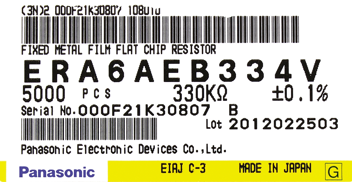 This is ERA Series Thin Film Surface Mount Fixed Resistor 805 Case 330kΩ ±0.1% 0.125W ±25ppm/°C manufactured by Panasonic. The manufacturer part number is ERA6AEB334V. The product era, is a highly preferred choice for users. It carries 330kω resistance. It exhibits an excellent temperature coefficient of ±25ppm/°c. This product use thin film technology. Whereas, the minimum operating temperature of the product is -55°c. Feature 0.125w of power rating. It has a maximum operating temperature of +155°c. It features ±0.1% of tolerance value. Concerning its package and casing, it is 0805 (2012m).