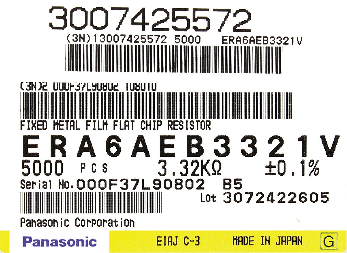 This is ERA Series Thin Film Surface Mount Fixed Resistor 805 Case 3.32kΩ ±0.1% 0.125W ±25ppm/°C manufactured by Panasonic. The manufacturer part number is ERA6AEB3321V. The product era, is a highly preferred choice for users. It carries 3.32kω resistance. It exhibits an excellent temperature coefficient of ±25ppm/°c. This product use thin film technology. Whereas, the minimum operating temperature of the product is -55°c. Feature 0.125w of power rating. It has a maximum operating temperature of +155°c. It features ±0.1% of tolerance value. Concerning its package and casing, it is 0805 (2012m).