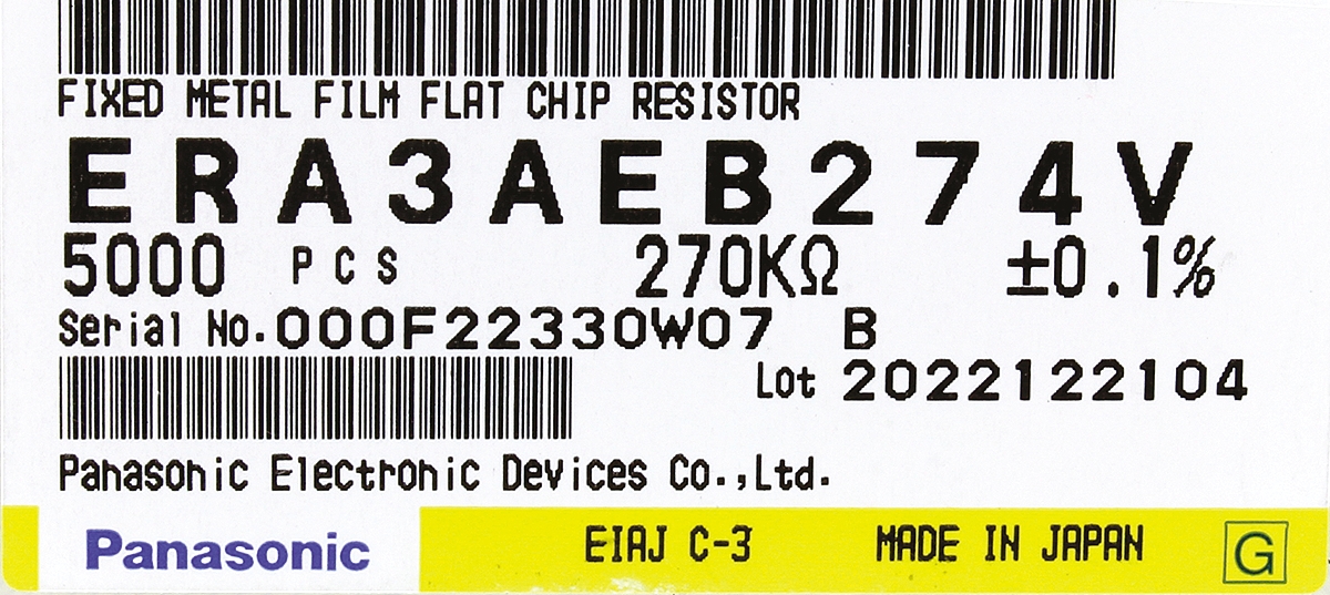This is ERA Series Metal Film Thin Film Surface Mount Fixed Resistor 0603 Case 270kΩ ±0.1% 0.1W ±25ppm/°C manufactured by Panasonic. The manufacturer part number is ERA3AEB274V. Whereas, the minimum operating temperature of the product is -55°c. The product era, is a highly preferred choice for users. It carries 270kω resistance. It exhibits an excellent temperature coefficient of ±25ppm/°c. This product use thin film technology. Feature 0.1w of power rating. It has a maximum operating temperature of +155°c. It features ±0.1% of tolerance value. Concerning its package and casing, it is 0603 (1608m).