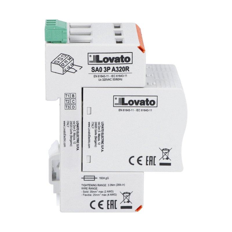 This is Single Phase Surge Protector 60kA DIN Rail Mount manufactured by Lovato. The manufacturer part number is SA03PA320R. The product has -40 → +80 °c of operating temperature range. The product sa0, is a highly preferred choice for users. The voltage protection rating is < 1.5kv . The product is available in din rail style. This surge protector device is highly durable product with a variety of applications. Whereas, the minimum operating temperature of the product is -40°c. Its electrical phase configuration includes single. It can withstand a maximum 60ka surge current . It has a maximum operating temperature of '+80°c.