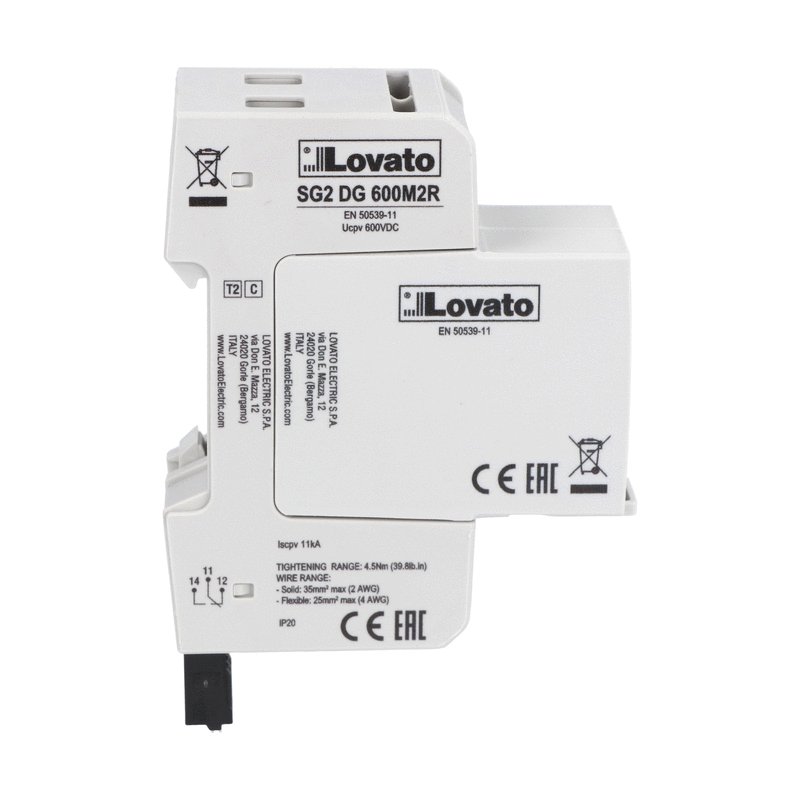 This is Single Phase Surge Protector 40kA DIN Rail Mount manufactured by Lovato. The manufacturer part number is SG2DG600M2R. Moreover, its impulse discharge current is about 30ka . It is IP rated with ip20. The product sg2dg, is a highly preferred choice for users. The voltage protection rating is 1.9kv . Its accurate length is 36mm. Furthermore, the product is 70 mm wide. The product comes in 105mm depth. Whereas, the minimum operating temperature of the product is -40°c. Its electrical phase configuration includes 1. It features type 2 range. It can withstand a maximum 40ka surge current . surge protector is a versatile product designed to provide user-defined applications. It has a maximum operating temperature of 85°c. It has a din rail type mount .