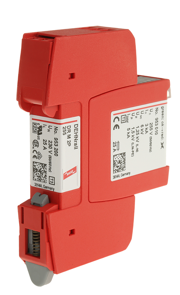 This is 255 V ac/dc 5kA DR Surge Arrester DIN Rail Mounting manufactured by Dehn. The manufacturer part number is DR M 2P 255. The given dimensions of the product include 90 x 18 x 66mm. The product is available in din rail configuration. The product dr, is a highly preferred choice for users. Whereas, the minimum operating temperature of the product is -40°c. Its accurate length is 90mm. In addition, the height is 66mm. The product comes in 18mm depth. It has a maximum 255 v ac/dc voltage rating. It can withstand a maximum 5ka surge current . It has a maximum operating temperature of +80°c. Its suppressor is of surge arrester type .