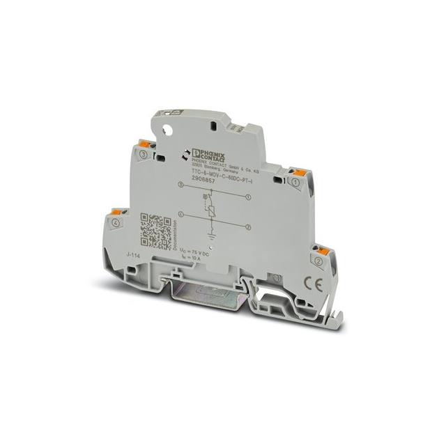 This is 75 V dc 2 (Discharge)kA TTC Surge Protection Device DIN Rail Mounting manufactured by Phoenix Contact. The manufacturer part number is 2906857. The given dimensions of the product include 39.5 x 6.2 x 92mm. The product is available in din rail configuration. The product ttc-6-mov-c-60dc-pt-i, is a highly preferred choice for users. Its accurate length is 39.5mm. In addition, the height is 92mm. The product comes in 6.2mm depth. Whereas, the minimum operating temperature of the product is -40°c. It has a maximum 75 v dc voltage rating. It can withstand a maximum 2ka surge current . It has a maximum operating temperature of +85°c. Its suppressor is of surge protection device type . The product also features robust plastic housing material. It is approved by ccsaus, csa, csaus, ul. It comes in pdu, surge protector configuration. The phoenix contact's product offers user-desired applications. The product is utilised in various regions, including international. It has a long 5 weeks standard lead time. The product ttc, is a highly preferred choice for users. In addition, bulk is the available packaging type of the product.