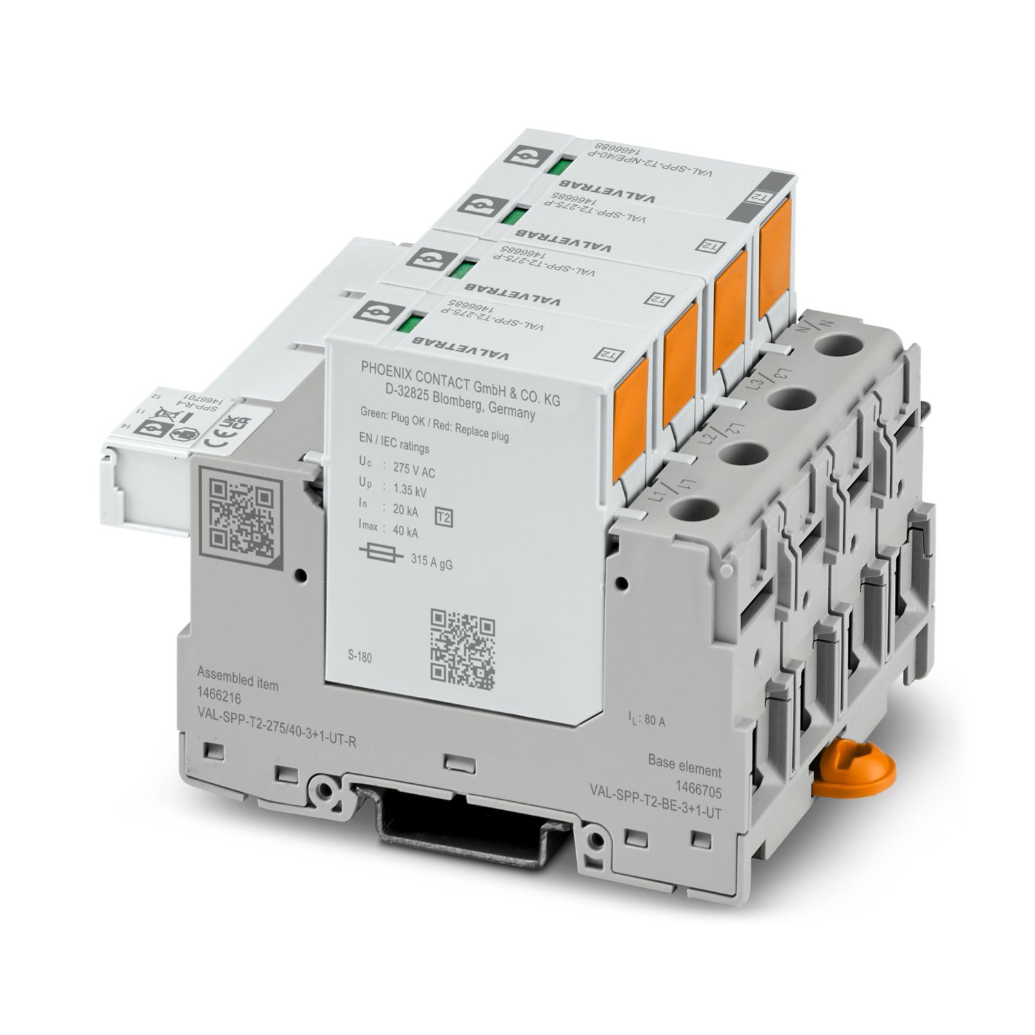 This is VAL-SPP Surge Arrester 275 V dc Maximum Voltage Rating 80kA Maximum Surge Current Type 2 Arrester manufactured by Phoenix Contact. The manufacturer part number is 1466216. The product is available in din rail configuration. The product val-spp, is a highly preferred choice for users. It has a maximum 275 v dc voltage rating. It can withstand a maximum 80ka surge current . Its suppressor is of type 2 arrester type .