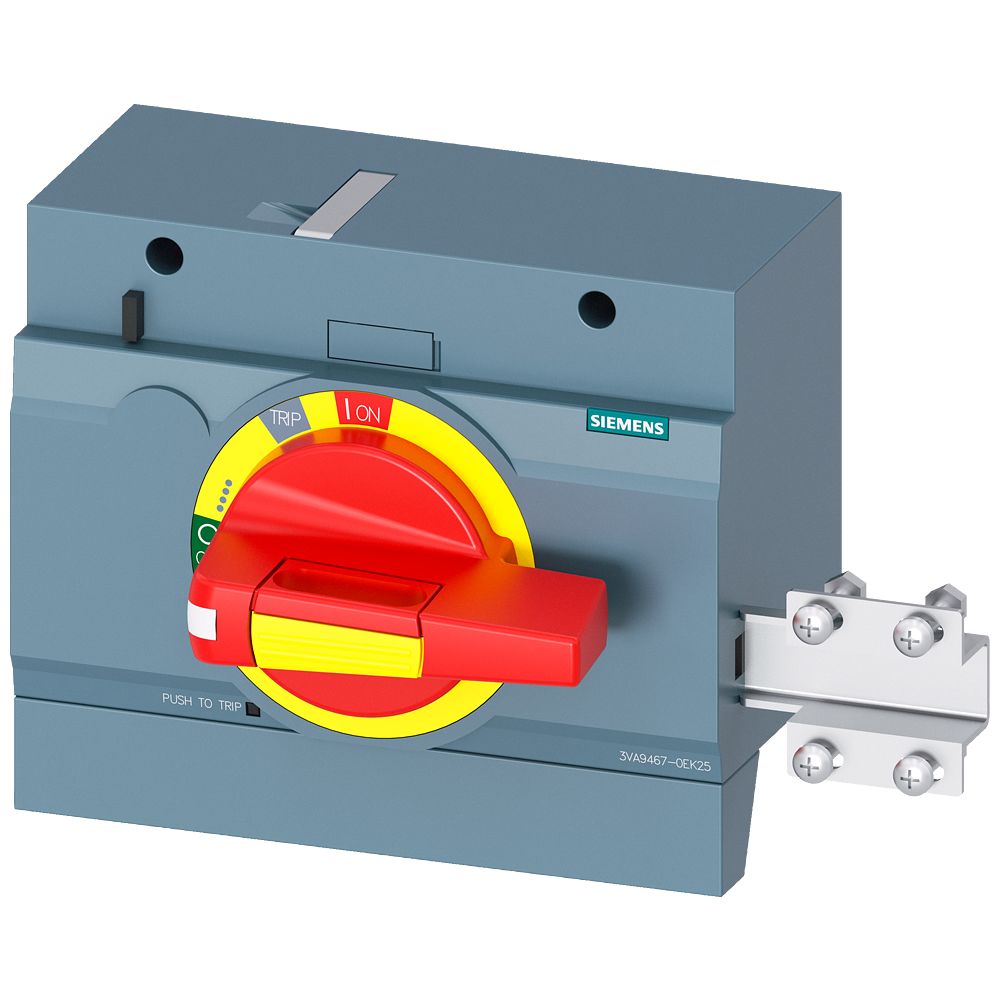 This is SENTRON Front Mounted Rotary Operator manufactured by Siemens. The manufacturer part number is 3VA9467-0EK25. The product sentron, is a highly preferred choice for users. It has a decent grey colour. It is a type of front mounted rotary operator accessory.
