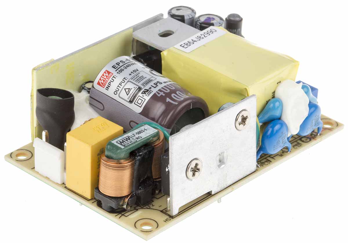 This is 65W Embedded Switch Mode Power Supply SMPS 4.34A 15V dc manufactured by Mean Well. The manufacturer part number is EPS-65S-15. Additionally, the product is supplied with 1 outputs. The product has +70°c maximum temperature. The product is available in chassis mount configuration. The typical product's weight is 150g. It is a highly efficient product with an 87% of high efficiency. While its minimum temperature is -30°c. Its accurate length is 101.6mm. Furthermore, the product is 50.8mm wide. The product comes in 29mm depth. Its input voltage is 127 → 370 v dc, 90 → 264 v ac. The package is a sort of open frame. Features a 15v dc output voltage. Feature 65w of power rating. It carries 4.34a output current.