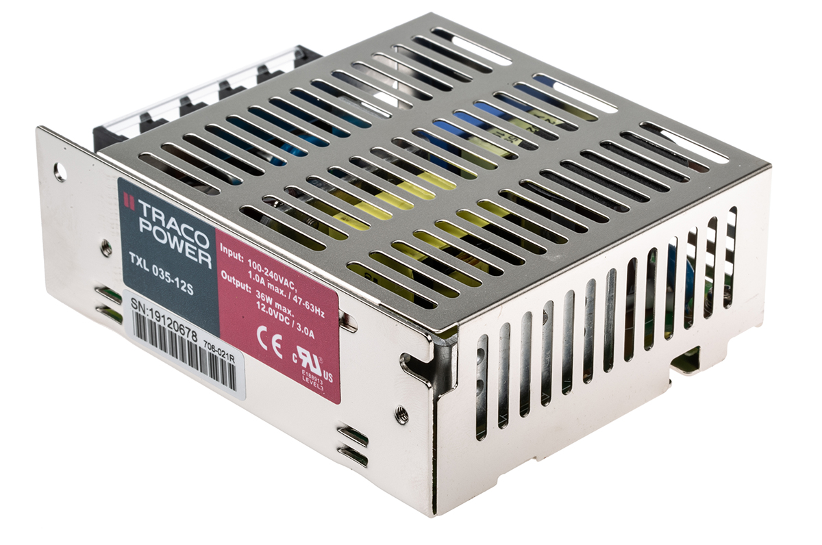 This is 35W Embedded Switch Mode Power Supply SMPS 3A 12V dc manufactured by TRACOPOWER. The manufacturer part number is TXL 035-12S. Additionally, the product is supplied with 1 outputs. The product has +70°c maximum temperature. The product is available in chassis mount configuration. The typical product's weight is 300g. It is a highly efficient product with an 70 → 84% of high efficiency. While its minimum temperature is -10°c. Its accurate length is 109mm. Furthermore, the product is 82mm wide. The product comes in 35mm depth. Its input voltage is 120 → 375 v dc, 85 → 264 v ac. The package is a sort of enclosed. Features a 12v dc output voltage. Feature 35w of power rating. It carries 3a output current.