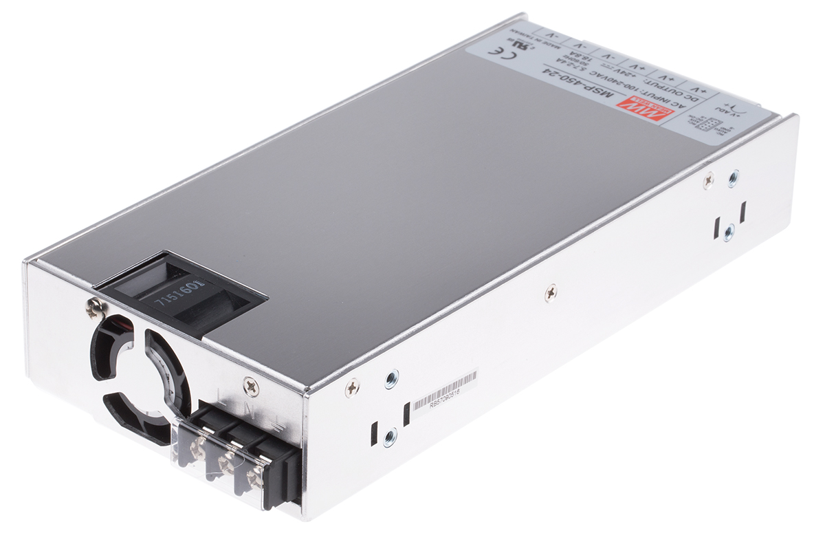 This is 451W Embedded Switch Mode Power Supply SMPS 18.8A 24V dc Medical Approved manufactured by Mean Well. The manufacturer part number is MSP-450-24. Additionally, the product is supplied with 1 outputs. The product has +70°c maximum temperature. The product is available in rack mount configuration. The typical product's weight is 1.2kg. While its minimum temperature is -40°c. Its accurate length is 218mm. Furthermore, the product is 105mm wide. The product comes in 41mm depth. Its input voltage is 120 → 370 v dc, 85 → 264 v ac. The package is a sort of enclosed. Medical Approval - yes. Features a 24v dc output voltage. Feature 451w of power rating. It carries 18.8a output current.