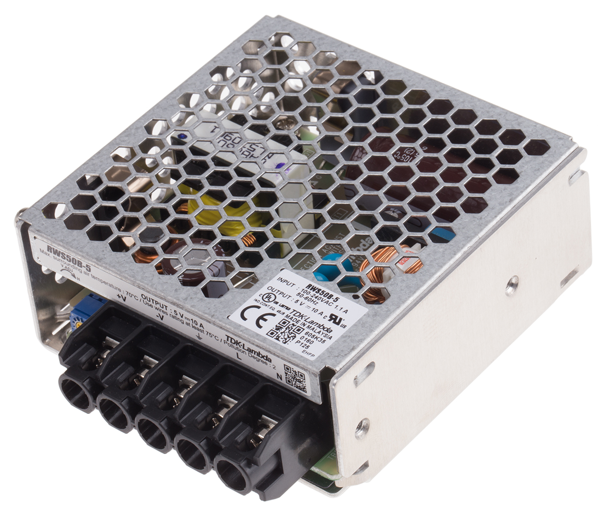This is 50W Embedded Switch Mode Power Supply SMPS 10A 5V dc manufactured by TDK-Lambda. The manufacturer part number is RWS-50B-5. Additionally, the product is supplied with 1 outputs. The product has +70°c maximum temperature. The product is available in chassis mount configuration. The typical product's weight is 230g. It is a highly efficient product with an 79% of high efficiency. While its minimum temperature is -10°c. Its accurate length is 82mm. Furthermore, the product is 81.5mm wide. The product comes in 34mm depth. Its input voltage is 120 → 370 v dc, 85 → 265 v ac. The package is a sort of enclosed. Features a 5v dc output voltage. Feature 50w of power rating. It carries 10a output current.