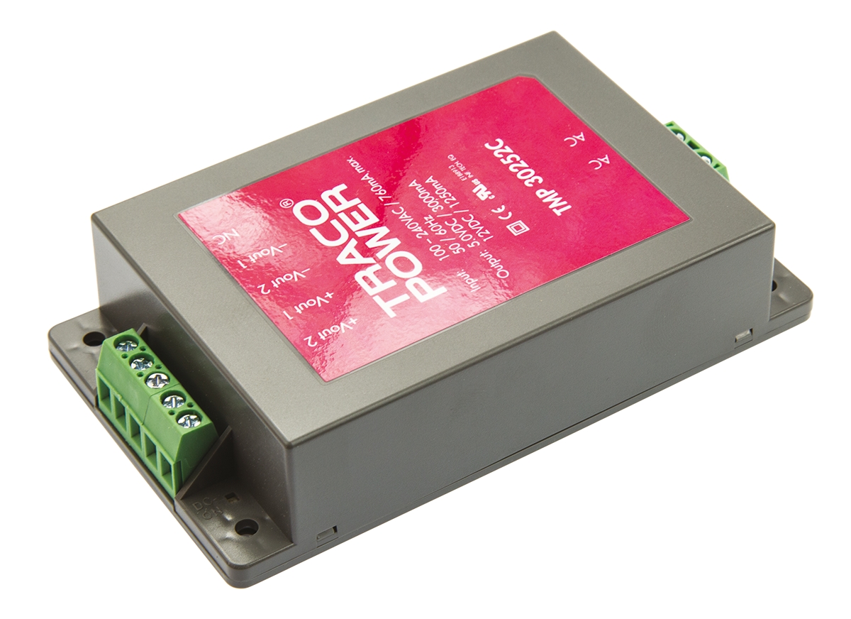 This is 30W Dual Output Embedded Switch Mode Power Supply SMPS 1.25 A 3 A 5/12V dc manufactured by TRACOPOWER. The manufacturer part number is TMP 30252C. Additionally, the product is supplied with 2 outputs. The product has +60°c maximum temperature. The product is available in chassis mount configuration. The typical product's weight is 191g. It is a highly efficient product with an 76% of high efficiency. While its minimum temperature is -25°c. Its accurate length is 112mm. Furthermore, the product is 63.8mm wide. The product comes in 25.6mm depth. Its input voltage is 120 → 370 v dc, 85 → 264 v ac. The package is a sort of encapsulated. Features a 5 v dc, 12 v dc output voltage. Feature 30w of power rating. It carries 1.25 a, 3a output current.