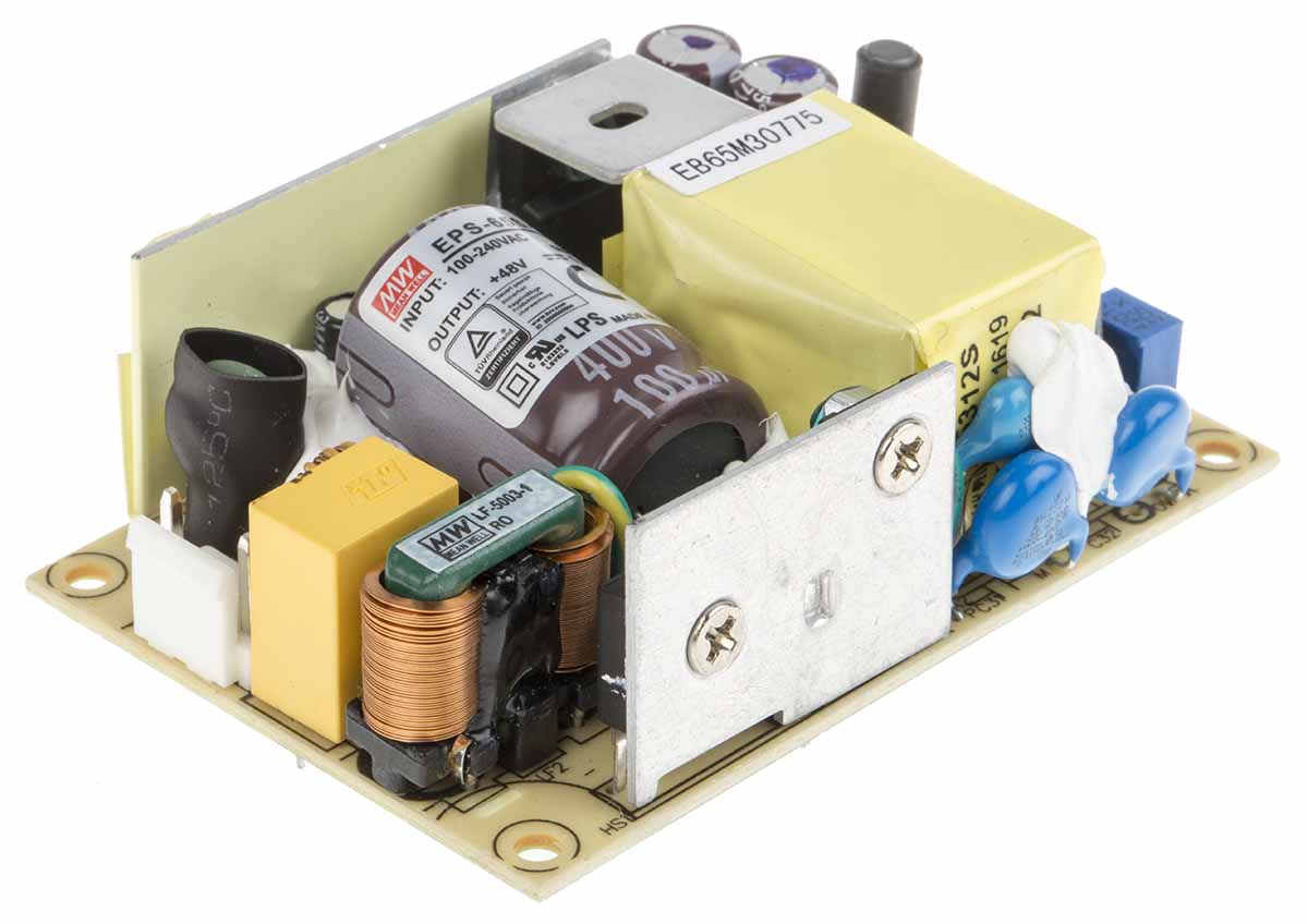 This is 65W Embedded Switch Mode Power Supply SMPS 1.36A 48V dc manufactured by Mean Well. The manufacturer part number is EPS-65S-48. Additionally, the product is supplied with 1 outputs. The product has +70°c maximum temperature. The product is available in chassis mount configuration. The typical product's weight is 150g. It is a highly efficient product with an 90% of high efficiency. While its minimum temperature is -30°c. Its accurate length is 101.6mm. Furthermore, the product is 50.8mm wide. The product comes in 29mm depth. Its input voltage is 127 → 370 v dc, 90 → 264 v ac. The package is a sort of open frame. Features a 48v dc output voltage. Feature 65w of power rating. It carries 1.36a output current.