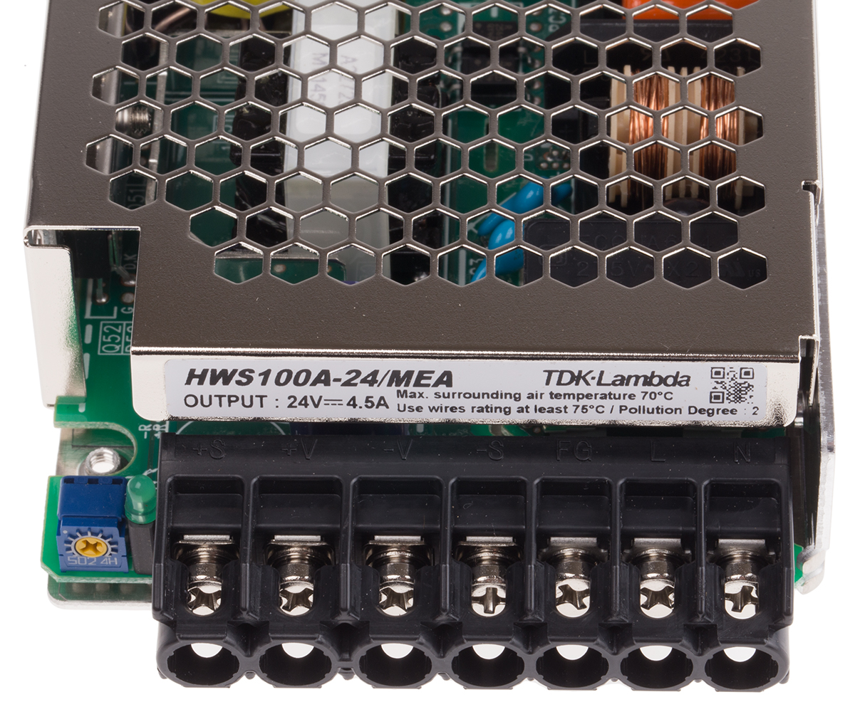 This is 108W Embedded Switch Mode Power Supply SMPS 4.5A 24V dc Medical Approved manufactured by TDK-Lambda. The manufacturer part number is HWS-100A-24/ME/A. Additionally, the product is supplied with 1 outputs. The product has +70°c maximum temperature. The product is available in chassis mount configuration. The typical product's weight is 450g. While its minimum temperature is -10°c. Its accurate length is 160mm. Furthermore, the product is 82mm wide. The product comes in 28mm depth. Its input voltage is 120 → 370 v dc, 85 → 265 v ac. The package is a sort of open frame. Features a 24v dc output voltage. Feature 108w of power rating. It carries 4.5a output current. Medical Approval - yes.
