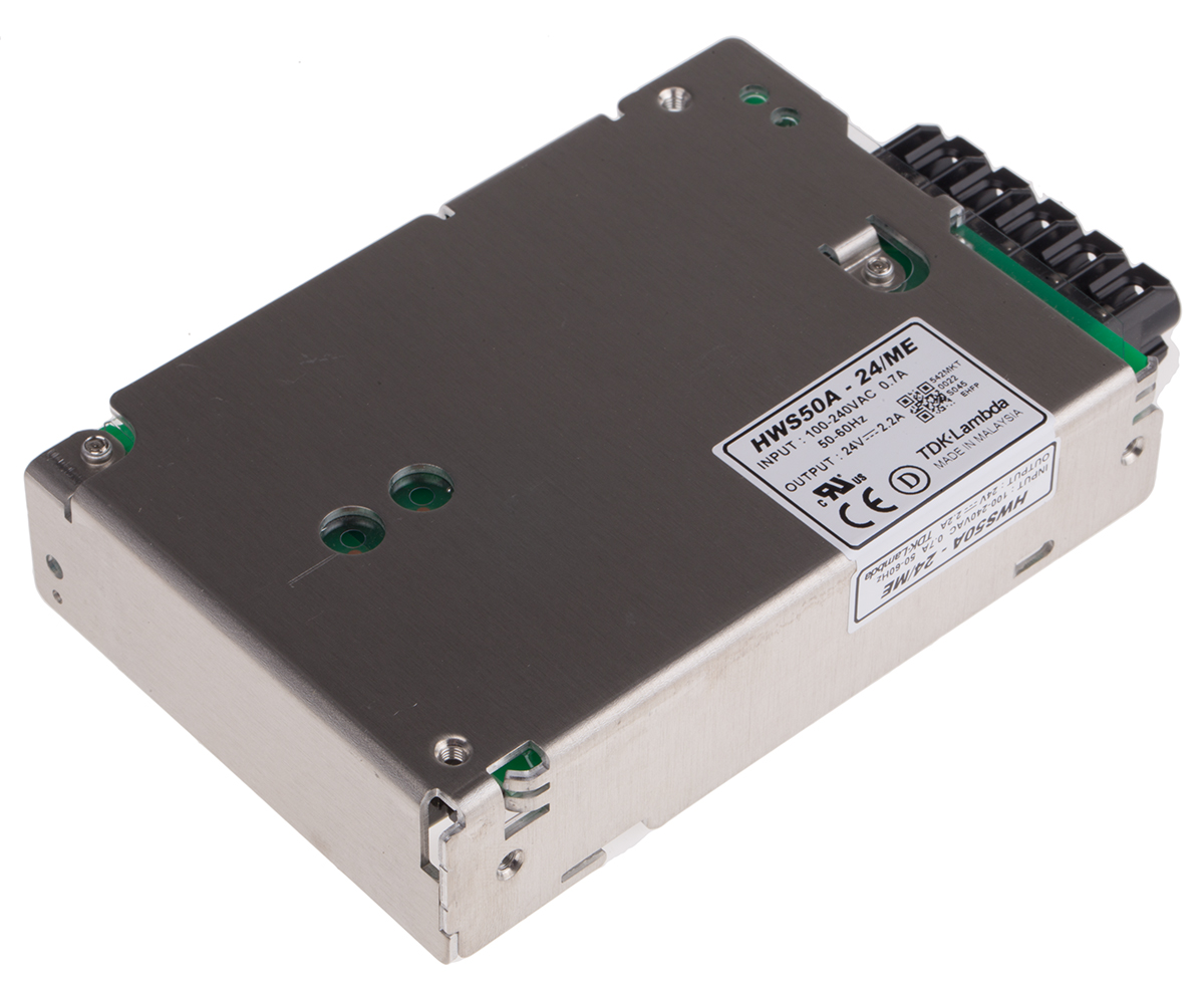 This is 52.8W Embedded Switch Mode Power Supply SMPS 2.2A 24V dc Medical Approved manufactured by TDK-Lambda. The manufacturer part number is HWS-50A-24/ME. Additionally, the product is supplied with 1 outputs. The product has +70°c maximum temperature. The product is available in chassis mount configuration. The typical product's weight is 280g. While its minimum temperature is -10°c. Its accurate length is 120mm. Furthermore, the product is 82mm wide. The product comes in 26.5mm depth. Its input voltage is 120 → 370 v dc, 85 → 265 v ac. The package is a sort of open frame. Medical Approval - yes. Features a 24v dc output voltage. Feature 52.8w of power rating. It carries 2.2a output current.