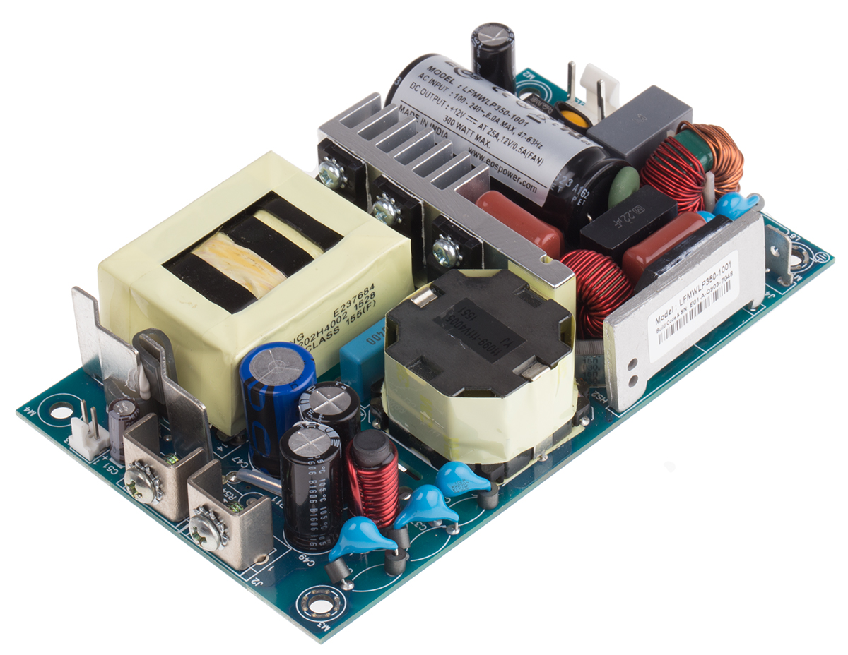 This is 350W Embedded Switch Mode Power Supply SMPS 25A 12V dc Medical Approved manufactured by EOS. The manufacturer part number is LFMWLT350-1001. Additionally, the product is supplied with 1 outputs. The product has +70°c maximum temperature. The product is available in chassis mount configuration. The typical product's weight is 450g. While its minimum temperature is -20°c. Its accurate length is 127mm. Furthermore, the product is 76.2mm wide. The product comes in 38.1mm depth. Its input voltage is 120 → 390 v dc, 90 → 264 v ac. The package is a sort of open frame. Features a 12v dc output voltage. Feature 350w of power rating. It carries 25a output current. Medical Approval - yes.