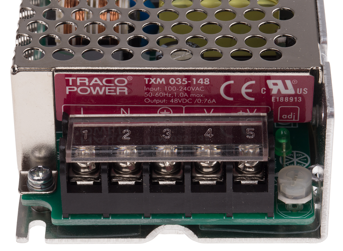 This is 35W Embedded Switch Mode Power Supply SMPS 750mA 48V dc manufactured by TRACOPOWER. The manufacturer part number is TXM 035-148. Additionally, the product is supplied with 1 outputs. The product has +70°c maximum temperature. The product is available in chassis mount configuration. The typical product's weight is 200g. It is a highly efficient product with an 88% of high efficiency. While its minimum temperature is -20°c. Its accurate length is 102mm. Furthermore, the product is 64mm wide. The product comes in 33mm depth. Its input voltage is 90 → 264v ac. The package is a sort of enclosed. Features a 48v dc output voltage. Feature 35w of power rating. It carries 750ma output current.
