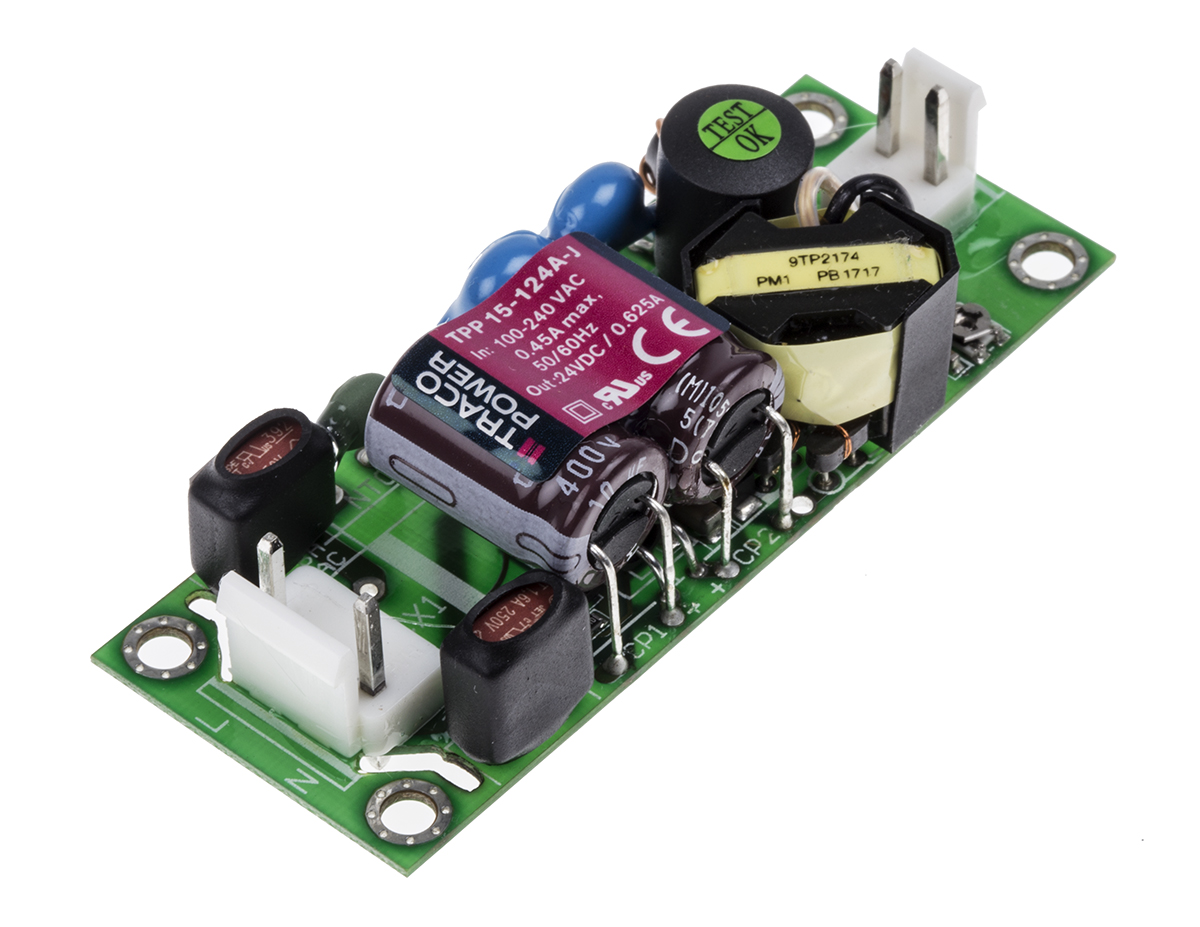 This is 15W Embedded Switch Mode Power Supply SMPS 0.62A 24V dc Medical Approved manufactured by TRACOPOWER. The manufacturer part number is TPP 15-124A-J. Additionally, the product is supplied with 1 outputs. The product has +85°c maximum temperature. The product is available in chassis mount configuration. The typical product's weight is 19g. While its minimum temperature is -40°c. Its accurate length is 66.2mm. Furthermore, the product is 25.4mm wide. The product comes in 15.7mm depth. Its input voltage is 120 → 370 v dc, 85 → 264 v ac. The package is a sort of open frame. Medical Approval - yes. Features a 24v dc output voltage. Feature 15w of power rating. Furthermore, its energy efficiency level is iii . It carries 620ma output current.