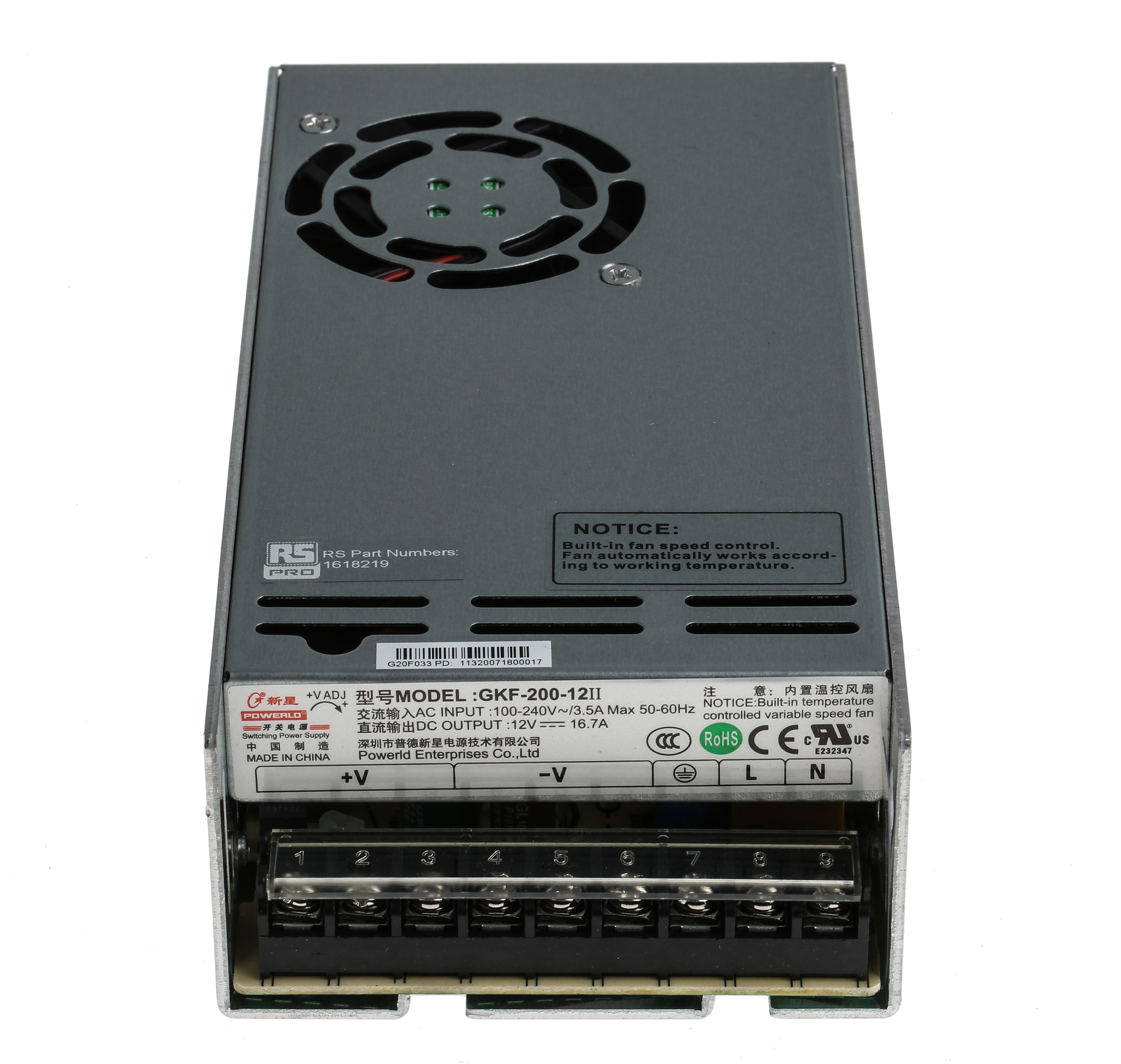 This is 200W Embedded Switch Mode Power Supply SMPS 16.7A 12V dc manufactured by RS Pro. The manufacturer part number is 161-8219. Additionally, the product is supplied with 1 outputs. The product has +70°c maximum temperature. It carries 16.7a output current. The product is available in pcb mount configuration. It is a highly efficient product with an 84% of high efficiency. While its minimum temperature is -25°c. Its accurate length is 199mm. Furthermore, the product is 99mm wide. The product comes in 50mm depth. Its input voltage is 120 → 370 v dc, 85 → 264 v ac. The package is a sort of enclosed. Features a 12v dc output voltage. Feature 200w of power rating.