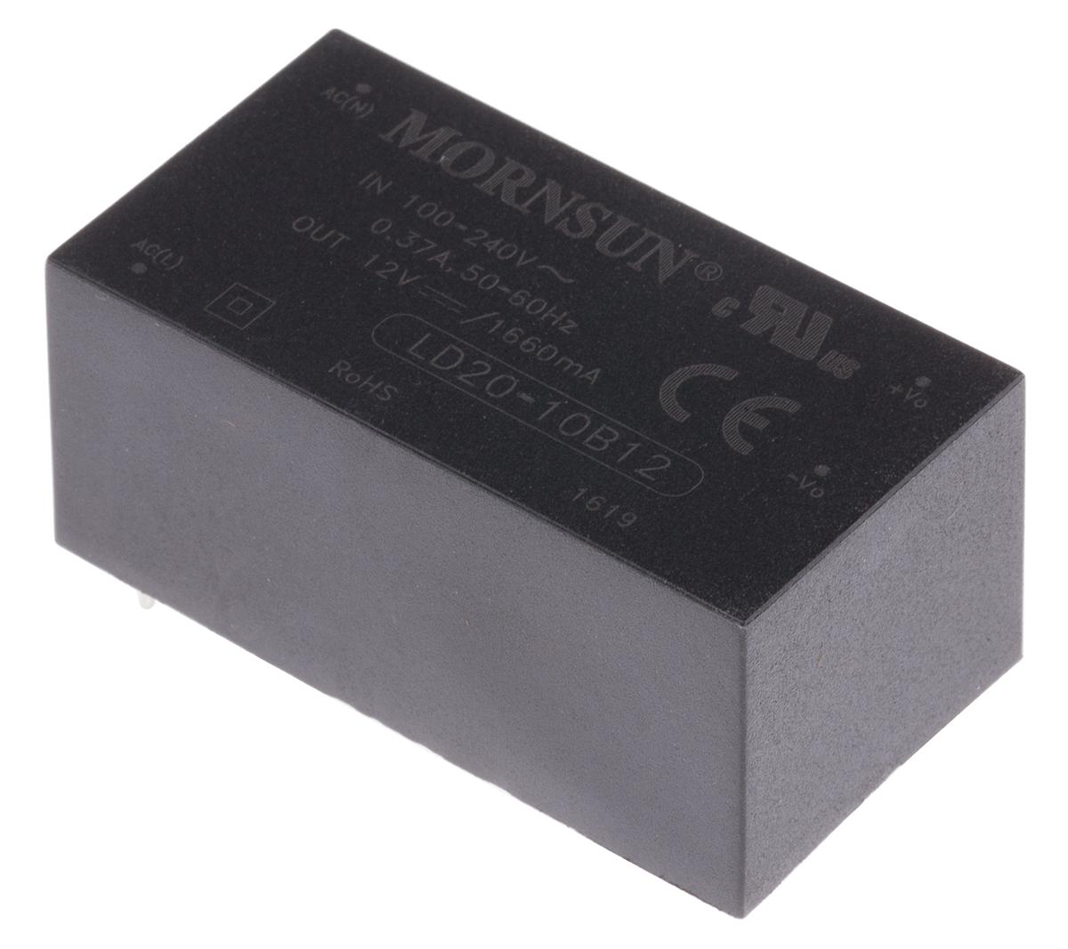 This is 20W Embedded Switch Mode Power Supply SMPS 1.66A 12V dc manufactured by RS Pro. The manufacturer part number is 751-1409. Additionally, the product is supplied with 1 outputs. The product has +70°c maximum temperature. The product is available in pcb mount configuration. The typical product's weight is 50g. Furthermore, the product is 28.5mm wide. While its minimum temperature is -40°c. Its accurate length is 53.5mm. It is a highly efficient product with an 82% of high efficiency. The product comes in 23.5mm depth. Its input voltage is 120 → 370 v dc, 85 → 264 v ac. The package is a sort of encapsulated. Features a 12v dc output voltage. Feature 20w of power rating. It carries 1.66a output current.