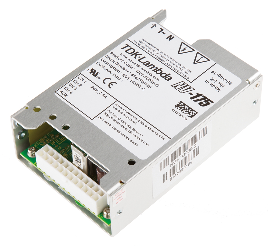This is 175W Embedded Switch Mode Power Supply SMPS 7.5A 24V dc Medical Approved manufactured by TDK-Lambda. The manufacturer part number is NV1-1G000-C. Additionally, the product is supplied with 1 outputs. The product has +70°c maximum temperature. The product is available in chassis mount configuration. The typical product's weight is 250g. While its minimum temperature is 0°c. Its accurate length is 127mm. Furthermore, the product is 76mm wide. The product comes in 31.75mm depth. Its input voltage is 90 → 264v ac. The package is a sort of enclosed. Features a 24v dc output voltage. Feature 175w of power rating. It carries 7.5a output current. Medical Approval - yes.