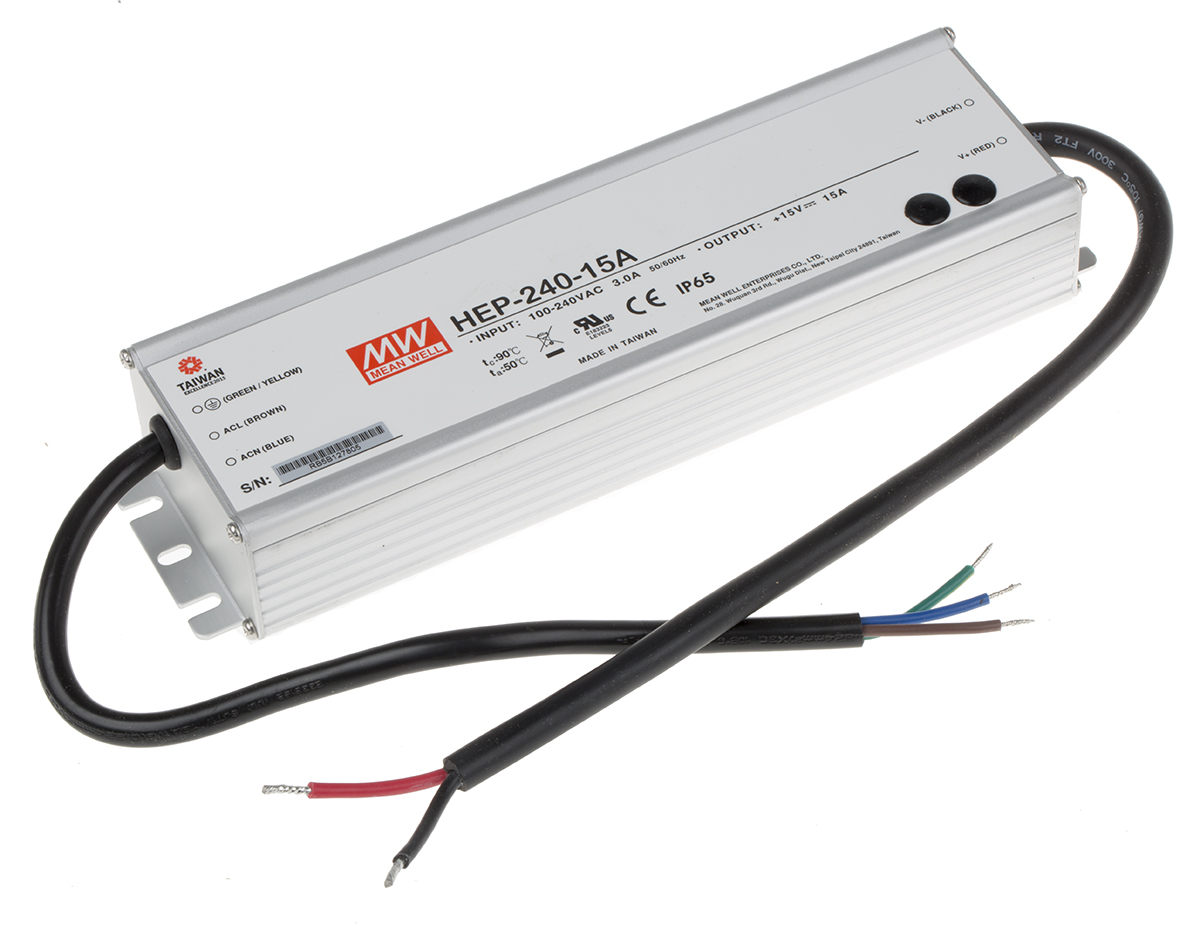 This is 225W Embedded Switch Mode Power Supply SMPS 15A 15V dc manufactured by Mean Well. The manufacturer part number is HEP-240-15A. Additionally, the product is supplied with 1 outputs. The product has +70°c maximum temperature. The product is available in chassis mount configuration. The typical product's weight is 1.3kg. Furthermore, the product is 68mm wide. While its minimum temperature is -55°c. Its accurate length is 244.2mm. It is a highly efficient product with an 90% of high efficiency. The product comes in 38.8mm depth. Its input voltage is 127 → 431 v dc, 90 → 305 v ac. The package is a sort of enclosed. Features a 15v dc output voltage. Feature 225w of power rating. It carries 15a output current.