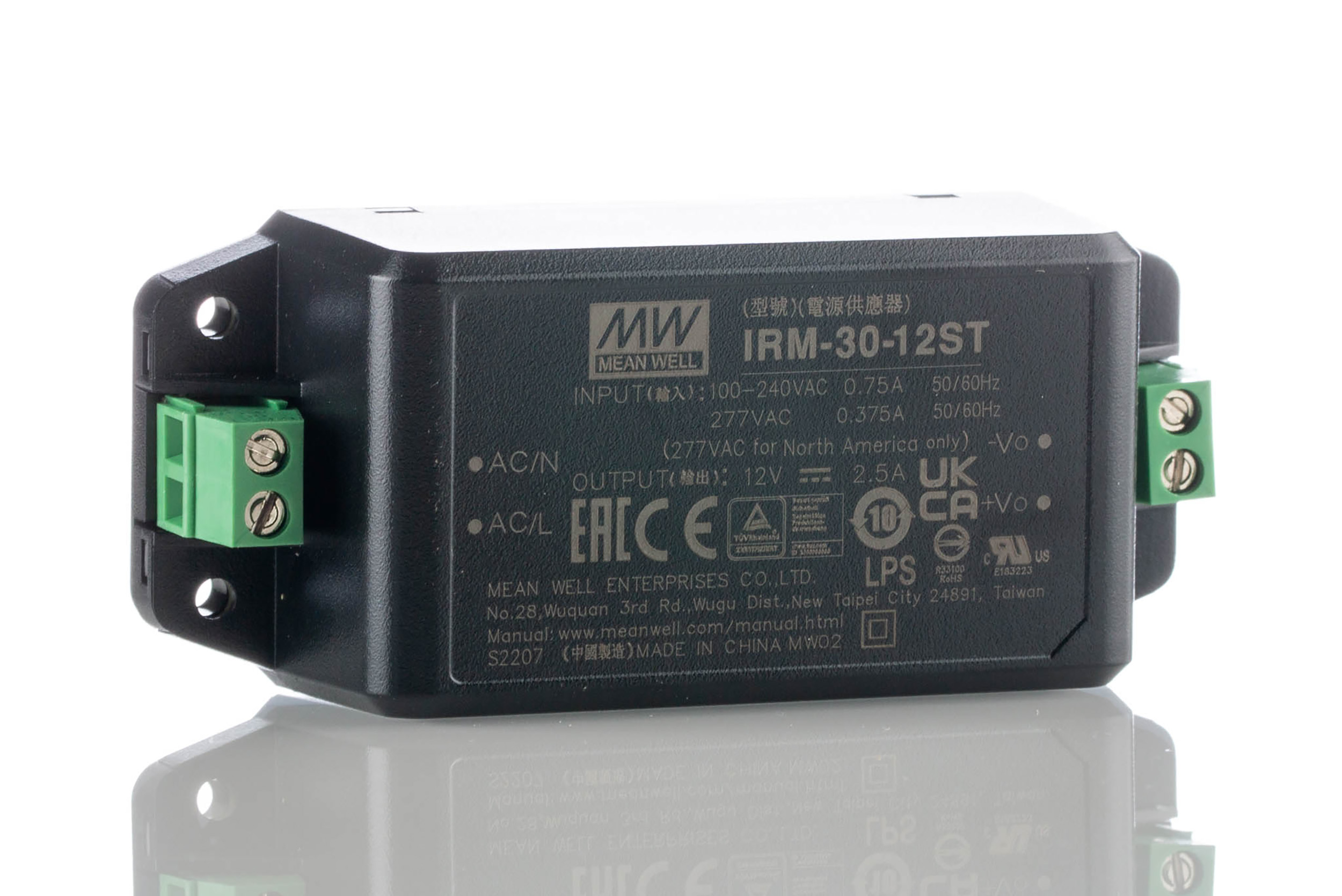 This is 30W Encapsulated Switch Mode Power Supply 0 → 2.5A 12V dc manufactured by Mean Well. The manufacturer part number is IRM-30-12ST. Additionally, the product is supplied with 1 outputs. The product has +70°c maximum temperature. The product is available in chassis mount configuration. The typical product's weight is 120g. Furthermore, the product is 39.5mm wide. While its minimum temperature is -30°c. Its accurate length is 91mm. It is a highly efficient product with an 88% of high efficiency. The product comes in 28.5mm depth. Its input voltage is 85 → 264v ac. The package is a sort of encapsulated. Features a 12v dc output voltage. Feature 30w of power rating. It carries 2.5a output current.