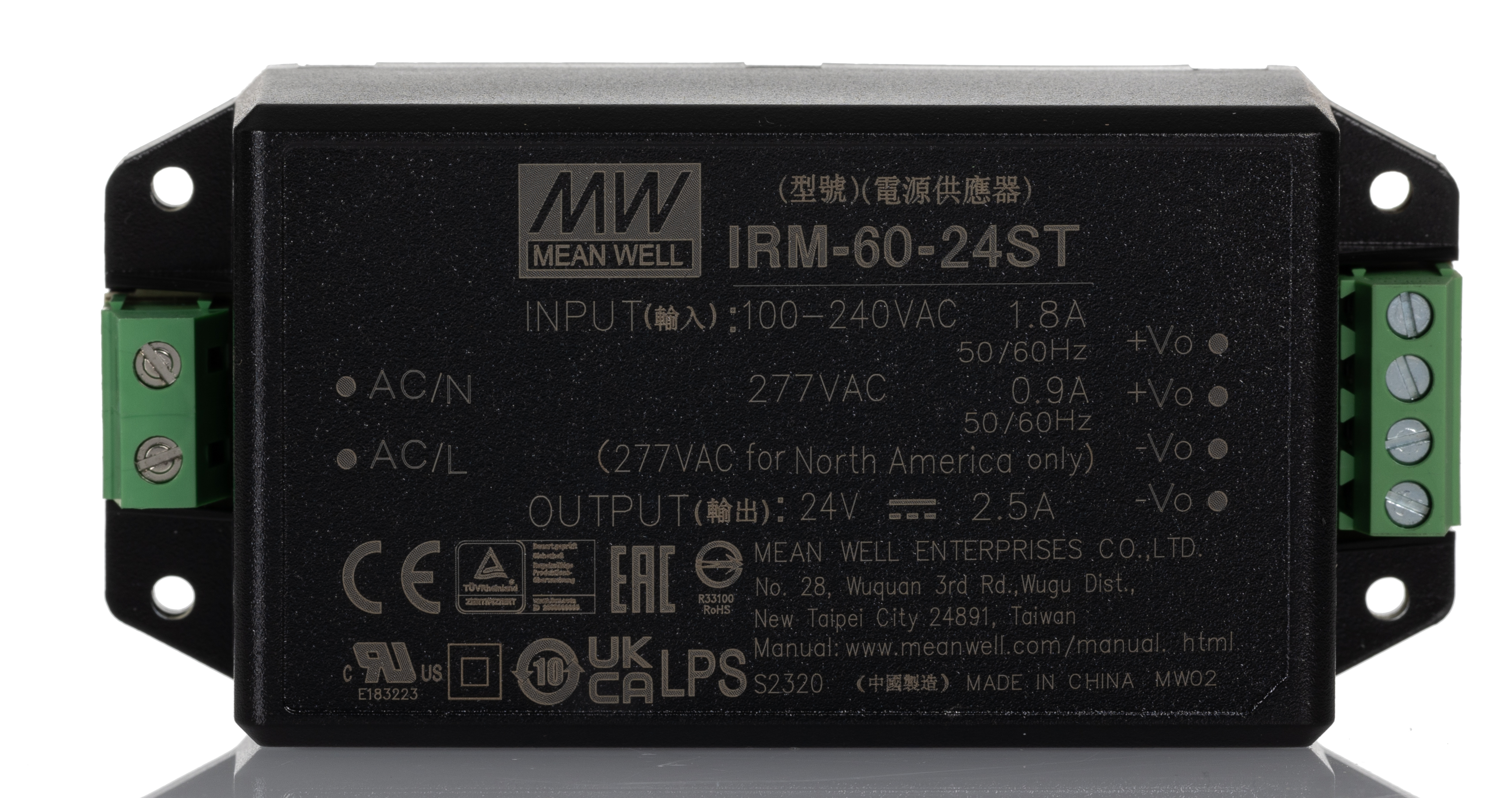 This is 60W Encapsulated Switch Mode Power Supply 0 → 2.5A 24V dc manufactured by Mean Well. The manufacturer part number is IRM-60-24ST. Additionally, the product is supplied with 1 outputs. The product has +70°c maximum temperature. The product is available in chassis mount configuration. The typical product's weight is 270g. Furthermore, the product is 52mm wide. While its minimum temperature is -30°c. Its accurate length is 109mm. It is a highly efficient product with an 90% of high efficiency. The product comes in 33.5mm depth. Its input voltage is 85 → 264v ac. The package is a sort of encapsulated. Features a 24v dc output voltage. Feature 60w of power rating. It carries 2.5a output current.