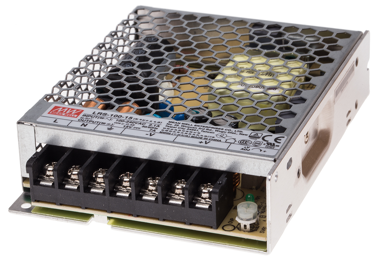 This is 105W Embedded Switch Mode Power Supply SMPS 7A 15V dc manufactured by Mean Well. The manufacturer part number is LRS-100-15. Additionally, the product is supplied with 1 outputs. The product has +70°c maximum temperature. The product is available in chassis mount configuration. The typical product's weight is 340g. It is a highly efficient product with an 88.5% of high efficiency. While its minimum temperature is -30°c. Its accurate length is 129mm. Furthermore, the product is 97mm wide. The product comes in 30mm depth. Its input voltage is 120 → 373 v dc, 85 → 264 v ac. The package is a sort of enclosed. Features a 15v dc output voltage. Feature 105w of power rating. It carries 7a output current.
