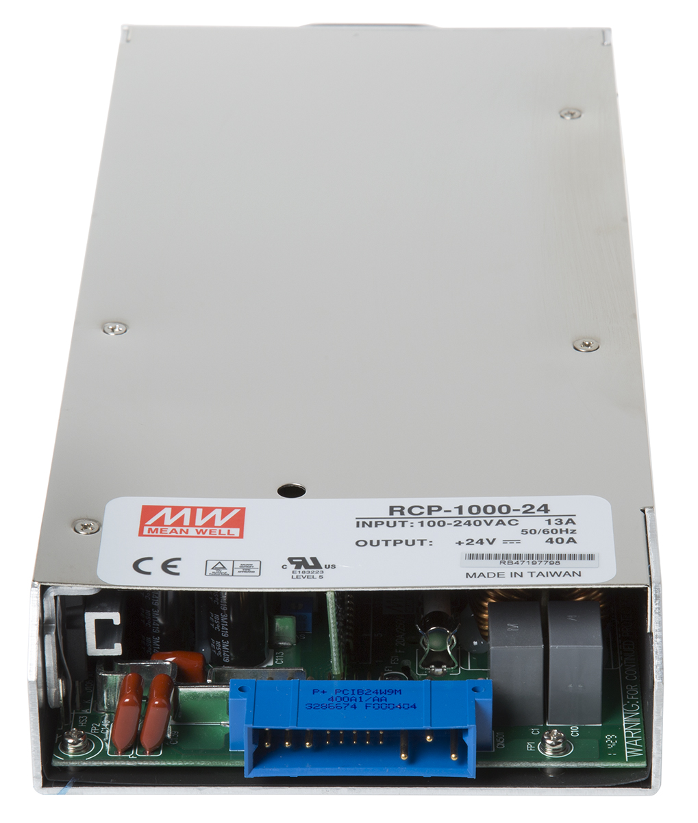 This is 960W Embedded Switch Mode Power Supply SMPS 40A 24V dc manufactured by Mean Well. The manufacturer part number is RCP-1000-24RS. Additionally, the product is supplied with 1 outputs. The product has +60°c maximum temperature. The product is available in chassis mount configuration. The typical product's weight is 1.9kg. Furthermore, the product is 127mm wide. While its minimum temperature is -20°c. Its accurate length is 295mm. It is a highly efficient product with an 87% of high efficiency. The product comes in 41mm depth. Its input voltage is 127 → 370 v dc, 90 → 264 v ac. The package is a sort of enclosed. Features a 24v dc output voltage. Feature 960w of power rating. It carries 40a output current.