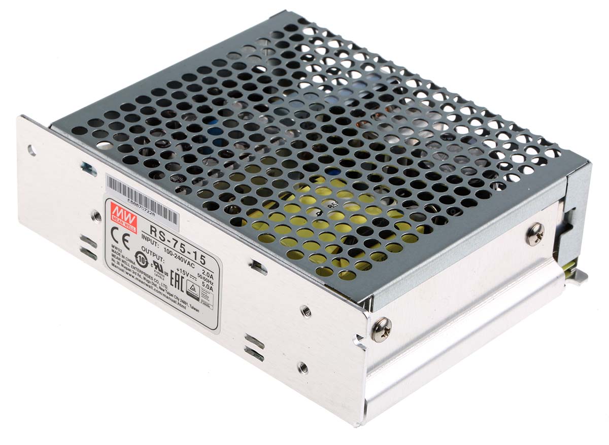 This is 75W Embedded Switch Mode Power Supply SMPS 5A 15V dc manufactured by Mean Well. The manufacturer part number is RS-75-15. Additionally, the product is supplied with 1 outputs. The product has +70°c maximum temperature. The product is available in chassis mount configuration. The typical product's weight is 410g. It is a highly efficient product with an 86% of high efficiency. While its minimum temperature is -25°c. Its accurate length is 129mm. Furthermore, the product is 97mm wide. The product comes in 38mm depth. Its input voltage is 125 → 373 v dc, 88 → 264 v ac. The package is a sort of enclosed. Features a 15v dc output voltage. Feature 75w of power rating. It carries 5a output current.