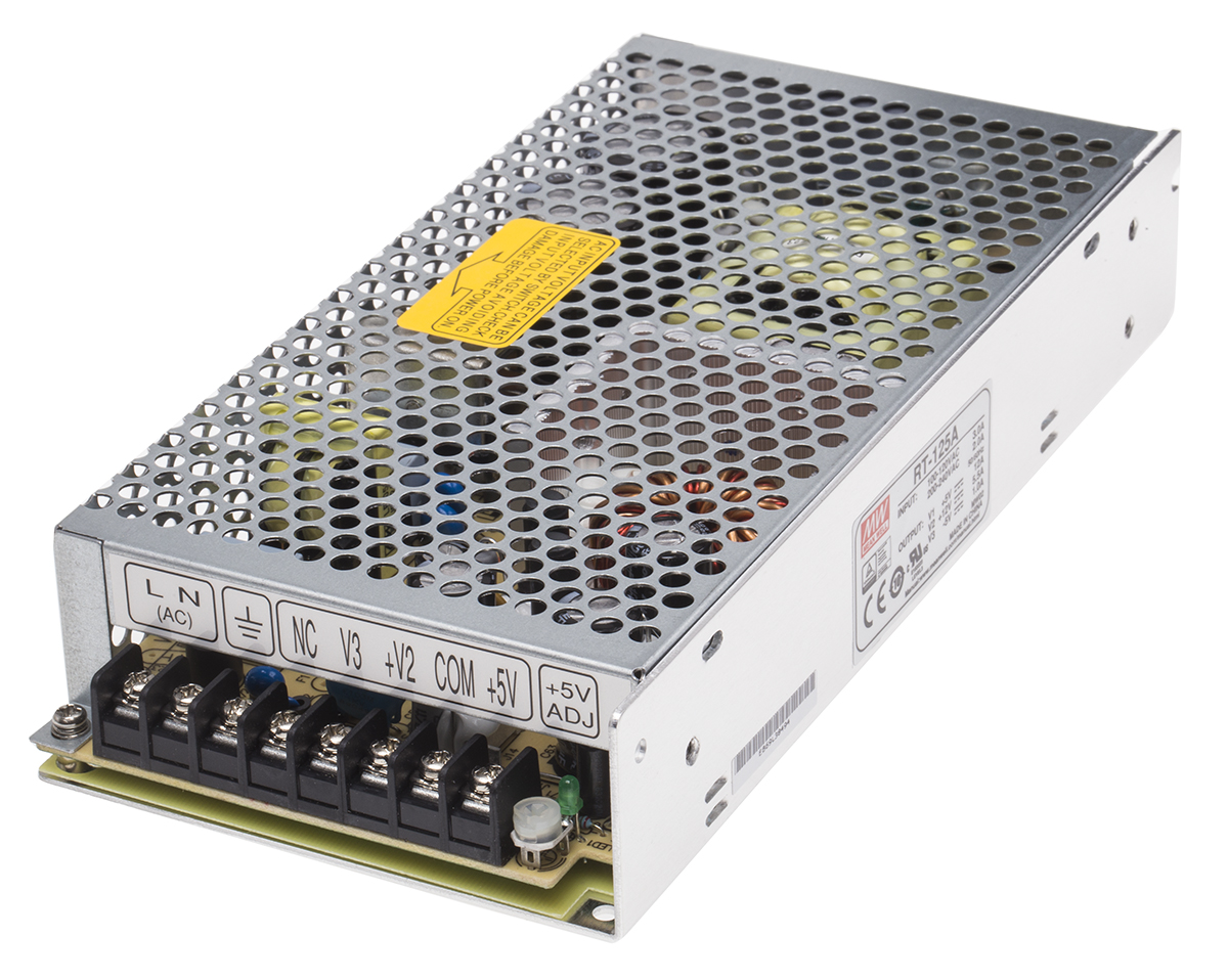 This is 131W Triple Output Embedded Switch Mode Power Supply SMPS 1 A 5.5 A 12 A ±5/12V dc manufactured by Mean Well. The manufacturer part number is RT-125A. Additionally, the product is supplied with 3 outputs. The product has +70°c maximum temperature. The product is available in chassis mount configuration. The typical product's weight is 700g. Furthermore, the product is 98mm wide. While its minimum temperature is -25°c. Its accurate length is 199mm. It is a highly efficient product with an 79% of high efficiency. The product comes in 38mm depth. Its input voltage is 176 → 264 v ac, 248 → 373 v dc, 88 → 132 v ac. The package is a sort of enclosed. Features a ±5 v dc, ±12v dc output voltage. Feature 131w of power rating. It carries 1 a, 5.5 a, 12 a output current.