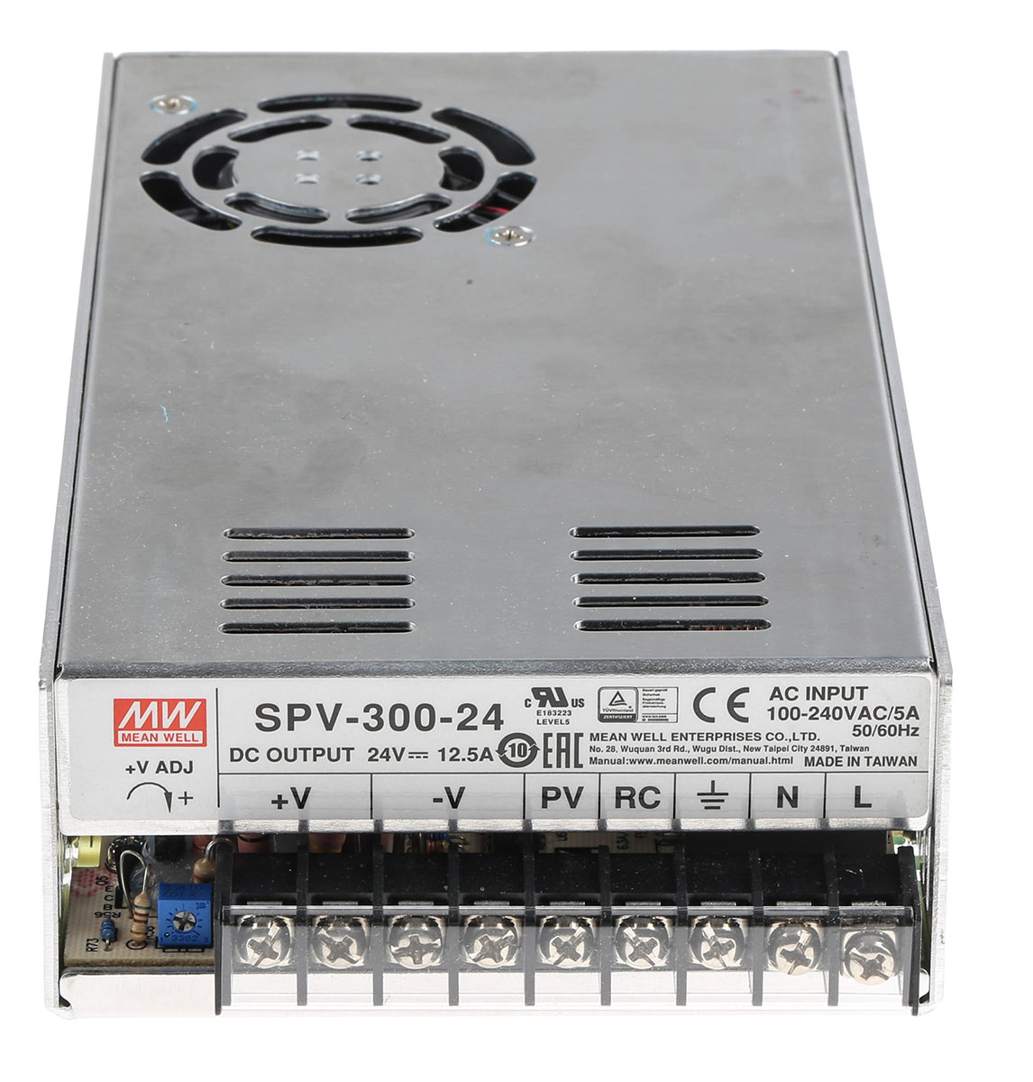 This is 300W Embedded Switch Mode Power Supply SMPS 12.5A 24V dc manufactured by Mean Well. The manufacturer part number is SPV-300-24RS. Additionally, the product is supplied with 1 outputs. The product has +65°c maximum temperature. The product is available in chassis mount configuration. The typical product's weight is 1.1kg. It is a highly efficient product with an 85% of high efficiency. While its minimum temperature is -20°c. Its accurate length is 215mm. Furthermore, the product is 115mm wide. The product comes in 50mm depth. Its input voltage is 124 → 370 v dc, 88 → 264 v ac. The package is a sort of enclosed. Features a 24v dc output voltage. Feature 300w of power rating. It carries 12.5a output current.