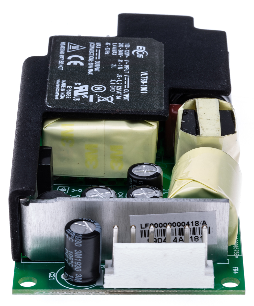 This is 60W Embedded Switch Mode Power Supply SMPS 5A 12V dc manufactured by EOS. The manufacturer part number is LFVLT60-1001. Additionally, the product is supplied with 1 outputs. The product has +50°c maximum temperature. The product is available in chassis mount configuration. The typical product's weight is 150g. Furthermore, the product is 51.8mm wide. While its minimum temperature is 0°c. Its accurate length is 101.6mm. It is a highly efficient product with an 82% of high efficiency. The product comes in 27.18mm depth. Its input voltage is 180 → 264 v ac, 90 → 132 v ac. The package is a sort of open frame. Features a 12v dc output voltage. Feature 60w of power rating. It carries 5a output current.