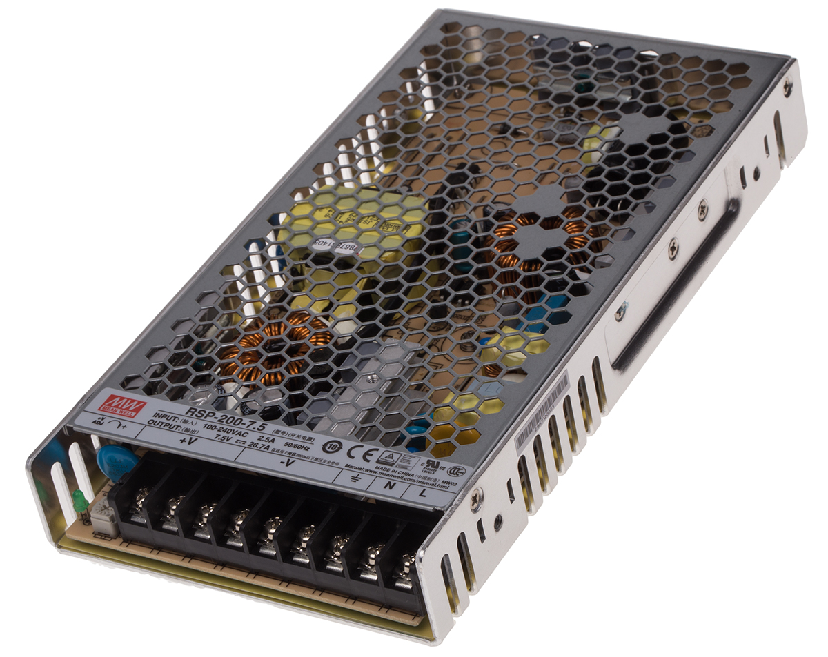 This is 200W Embedded Switch Mode Power Supply SMPS 26.7A 7.5V dc manufactured by Mean Well. The manufacturer part number is RSP-200-7.5. Additionally, the product is supplied with 1 outputs. The product has +70°c maximum temperature. The product is available in chassis mount configuration. The typical product's weight is 720g. It is a highly efficient product with an 89% of high efficiency. While its minimum temperature is -30°c. Its accurate length is 215mm. Furthermore, the product is 115mm wide. The product comes in 30mm depth. Its input voltage is 124 → 370 v dc, 88 → 264 v ac. The package is a sort of enclosed. Features a 7.5v dc output voltage. Feature 200w of power rating. It carries 26.7a output current.