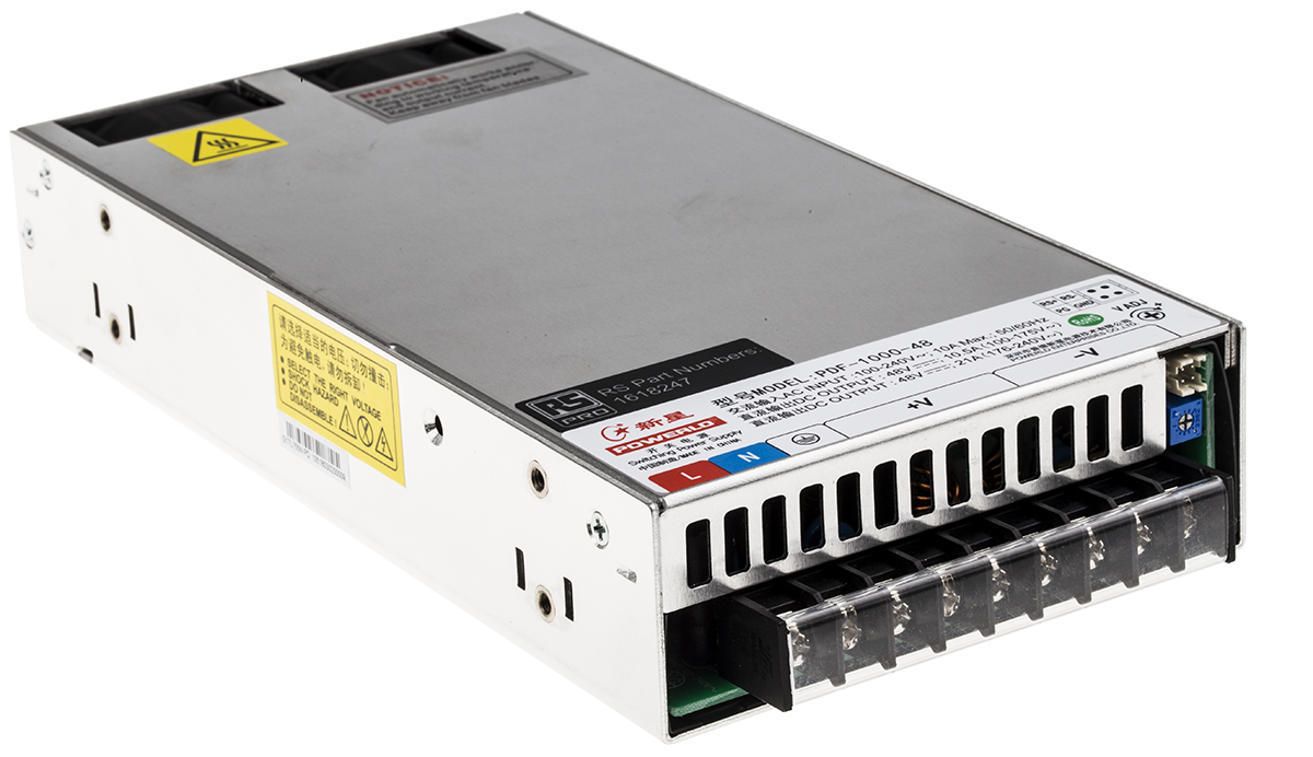 This is 1kW Embedded Switch Mode Power Supply SMPS 48V dc manufactured by RS Pro. The manufacturer part number is 161-8247. Feature 1kw of power rating. Features a 48v dc output voltage. The package is a sort of enclosed. The product is available in chassis mount configuration.