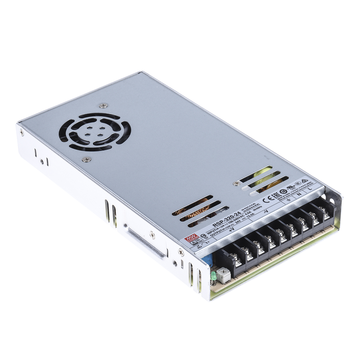 This is 321.6W Embedded Switch Mode Power Supply SMPS 13.4A 24V dc manufactured by Mean Well. The manufacturer part number is RSP-320-24. Additionally, the product is supplied with 1 outputs. The product has +70°c maximum temperature. The product is available in chassis mount configuration. The typical product's weight is 900g. It is a highly efficient product with an 89% of high efficiency. While its minimum temperature is -30°c. Its accurate length is 215mm. Furthermore, the product is 115mm wide. The product comes in 30mm depth. Its input voltage is 124 → 370 v dc, 88 → 264 v ac. The package is a sort of enclosed. Features a 24v dc output voltage. Feature 321.6w of power rating. It carries 13.4a output current.