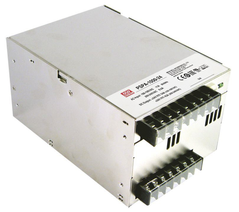This is Power Supply Switch Mode 24V 1008W manufactured by Mean Well. The manufacturer part number is PSPA-1000-24. Additionally, the product is supplied with 1 outputs. The product has +70°c maximum temperature. The product is available in chassis mount configuration. The typical product's weight is 1.9kg. Furthermore, the product is 120mm wide. While its minimum temperature is -20°c. Its accurate length is 170mm. It is a highly efficient product with an 93.5% of high efficiency. The product comes in 93mm depth. Its input voltage is 127 → 370 v dc, 90 → 264 v ac. The package is a sort of enclosed. Features a 24v dc output voltage. Feature 1.008kw of power rating. It carries 42a output current.