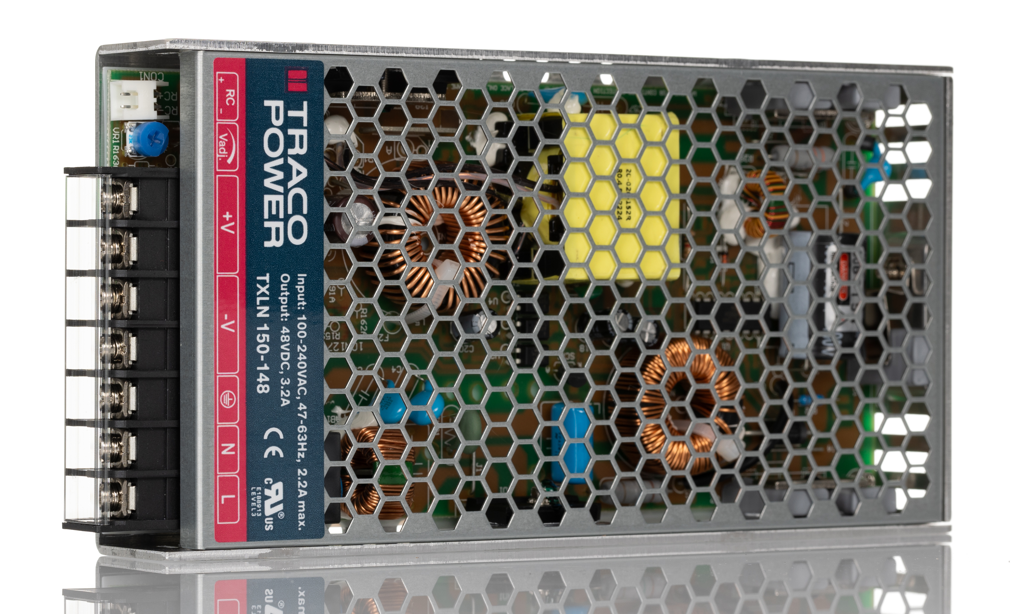 This is Embedded Switch Mode Power Supply SMPS 48V dc 3.2A 150W Enclosed manufactured by TRACOPOWER. The manufacturer part number is TXLN 150-148. Additionally, the product is supplied with 1 outputs. The product has +70°c maximum temperature. The product is available in chassis mount configuration. The typical product's weight is 560g. It is a highly efficient product with an 90% of high efficiency. The product txln, is a highly preferred choice for users. Its accurate length is 198.15mm. Furthermore, the product is 99mm wide. The product comes in 30mm depth. Its input voltage is 85 → 264v ac. The package is a sort of enclosed. Features a 48v dc output voltage. While its minimum temperature is -30°c. Feature 150w of power rating. It carries 3.2a output current.