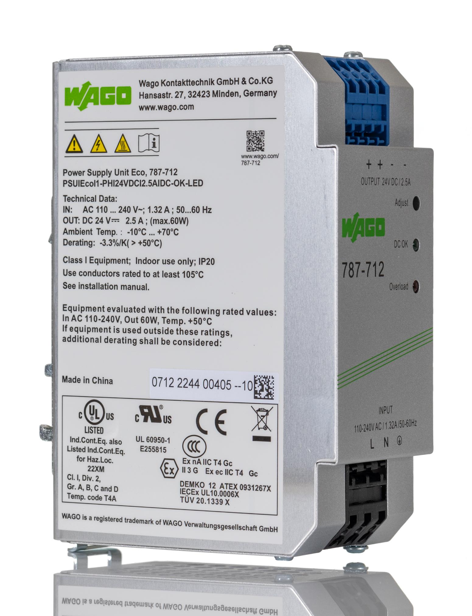 This is Power Supply 24V dc 2.5A 60W 1 Output manufactured by Wago. The manufacturer part number is 787-712. Additionally, the product is supplied with 1 outputs. The product has +70°c maximum temperature. It carries 2.5a output current. The product complies with all safety standards, such as ce. The product is available in din rail mount configuration. It is a highly efficient product with an 86% of high efficiency. The product 787, is a highly preferred choice for users. Its electrical phase configuration includes 1. It has ac, dc input voltage. In addition, the height is 92mm. The product is certified with atex hazardous area certification. Furthermore, the product is 50mm wide. The product comes in 136mm depth. The MTBF values include 480000h. Features a 24v dc output voltage. While its minimum temperature is -10°c. It has a/an dc output voltage . Feature 60w of power rating. It comes in switched mode configuration. Its input voltage is 85 → 264 v ac / 90 → 373v dc.