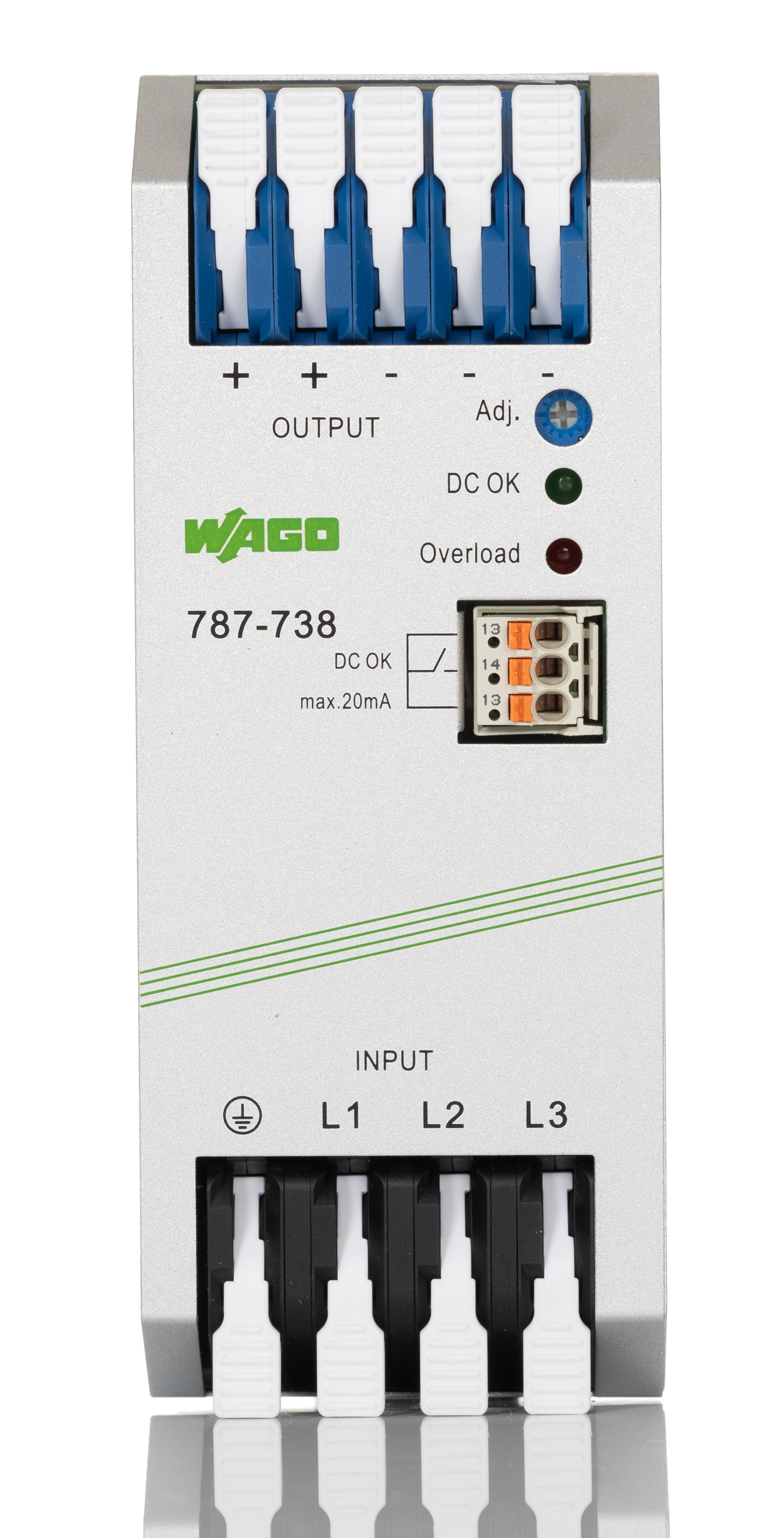 This is Power Supply 24V dc 6.25A 150W 1 Output manufactured by Wago. The manufacturer part number is 787-738. Additionally, the product is supplied with 1 outputs. It has 22 → 28v of output voltage adjustment range. Carries 100mv pk-pk ripple and noise. It has a/an dc output voltage . It carries 6.25a output current. The product is available in din rail mount configuration. It is a highly efficient product with an 87% of high efficiency. The product has +70°c maximum temperature. The product 787, is a highly preferred choice for users. Its electrical phase configuration includes 3. It has ac, dc input voltage. In addition, the height is 130mm. Furthermore, the product is 50mm wide. The product comes in 92mm depth. The MTBF values include 250000h. Features a 24v dc output voltage. While its minimum temperature is -25°c. Feature 150w of power rating. It comes in switched mode configuration. Its input voltage is 360 → 575 v ac / 500 → 650v dc.