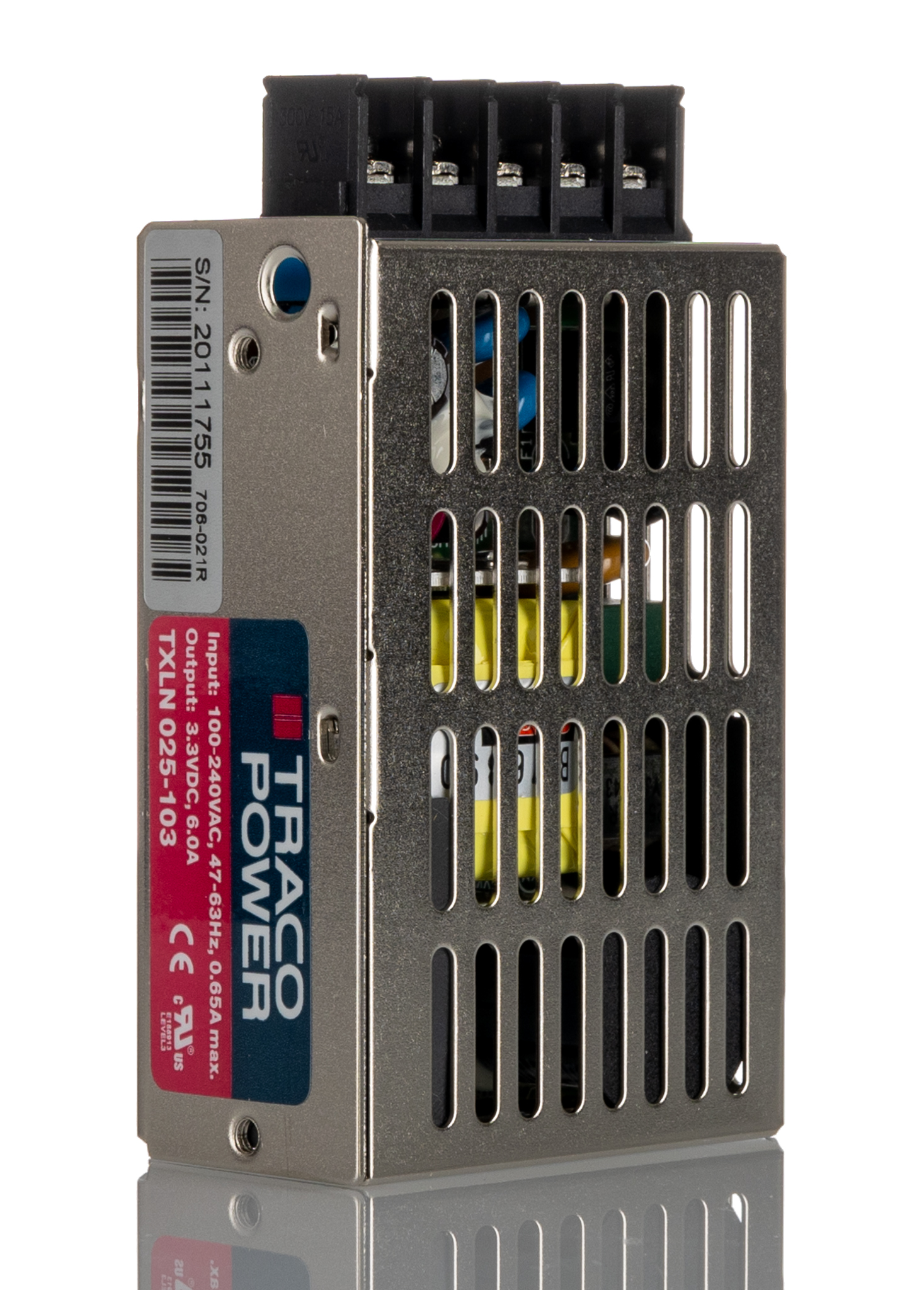 This is Switching Power Supply 3.3V dc 6A 20W 1 Output manufactured by TRACOPOWER. The manufacturer part number is TXLN 025-103. Additionally, the product is supplied with 1 outputs. The product has '+70°c maximum temperature. The product is available in chassis mount configuration. The typical product's weight is 180g. It is a highly efficient product with an 72% of high efficiency. The product txln, is a highly preferred choice for users. Its accurate length is 79mm. Furthermore, the product is 50.8mm wide. The product comes in 28.5mm depth. Its input voltage is 88 → 264v ac. The package is a sort of enclosed. Features a 3.3v dc output voltage. While its minimum temperature is -20°c. Feature 20w of power rating. It carries 6a output current.