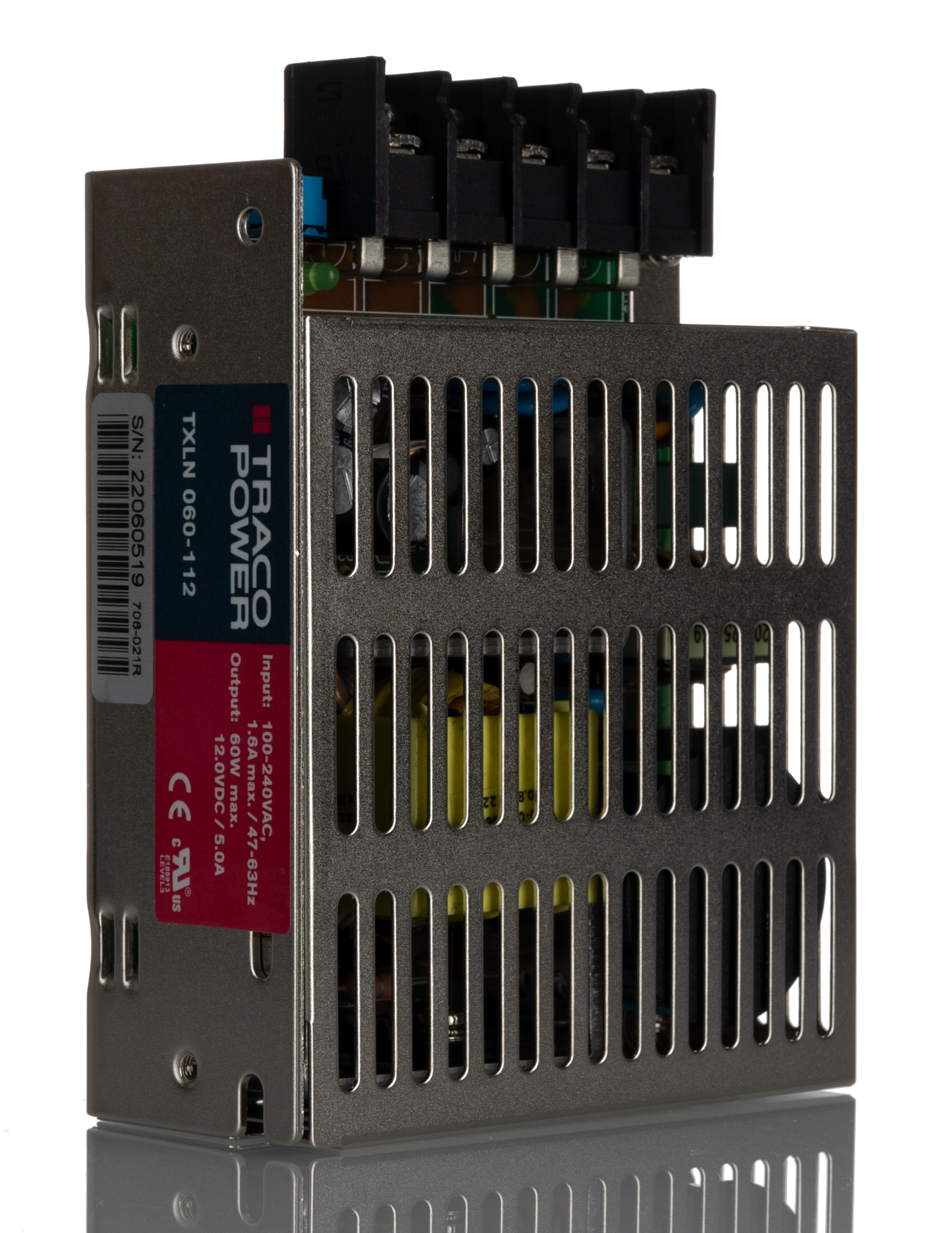 This is Switching Power Supply 12V dc 5A 60W 1 Output manufactured by TRACOPOWER. The manufacturer part number is TXLN 060-112. Additionally, the product is supplied with 1 outputs. The product has '+70°c maximum temperature. The product is available in chassis mount configuration. The typical product's weight is 340g. It is a highly efficient product with an 81% of high efficiency. The product txln, is a highly preferred choice for users. Its accurate length is 99mm. Furthermore, the product is 82mm wide. The product comes in 35mm depth. Its input voltage is 88 → 264v ac. The package is a sort of enclosed. Features a 12v dc output voltage. While its minimum temperature is -20°c. Feature 60w of power rating. It carries 5a output current.