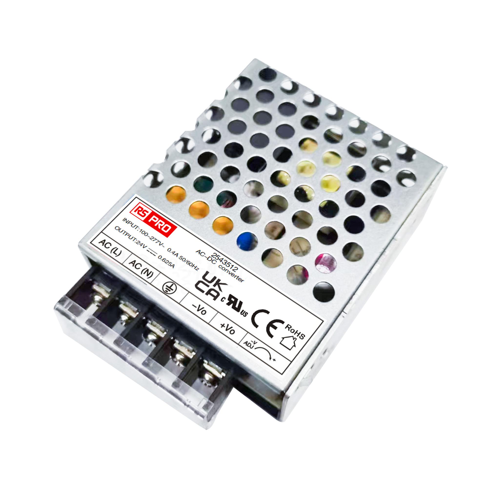 This is AC-DC Power Supply 24V dc 625mA 15W 1 Output 100 → 430V dc Input Voltage manufactured by RS PRO. The manufacturer part number is 254-3512. Additionally, the product is supplied with 1 outputs. The product has +70°c maximum temperature. The typical product's weight is 90g. Embedding Options: yes. It is a highly efficient product with an 0.83 of high efficiency. Its accurate length is 65mm. Furthermore, the product is 55mm wide. The product comes in 25mm depth. Its input voltage is 100 → 430v dc. The package is a sort of enclosed. Features a 24v dc output voltage. The product is available in chassis mount configuration. Feature 15w of power rating. It carries 625ma output current.