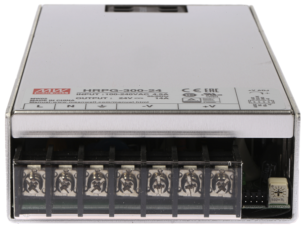 This is Switching Power Supply 24V dc 14A 336W 1 Output 120 → 370 V dc 85 → 264 V ac manufactured by MEAN WELL. The manufacturer part number is HRPG-300-24. Additionally, the product is supplied with 1 outputs. The product has +70°c maximum temperature. The product is available in chassis mount configuration. The typical product's weight is 950g. It is a highly efficient product with an 87% of high efficiency. While its minimum temperature is -40°c. Its accurate length is 199mm. Furthermore, the product is 105mm wide. The product comes in 41mm depth. Its input voltage is 120 → 370 v dc, 85 → 264 v ac. The package is a sort of enclosed. Features a 24v dc output voltage. Feature 336w of power rating. It carries 14a output current.