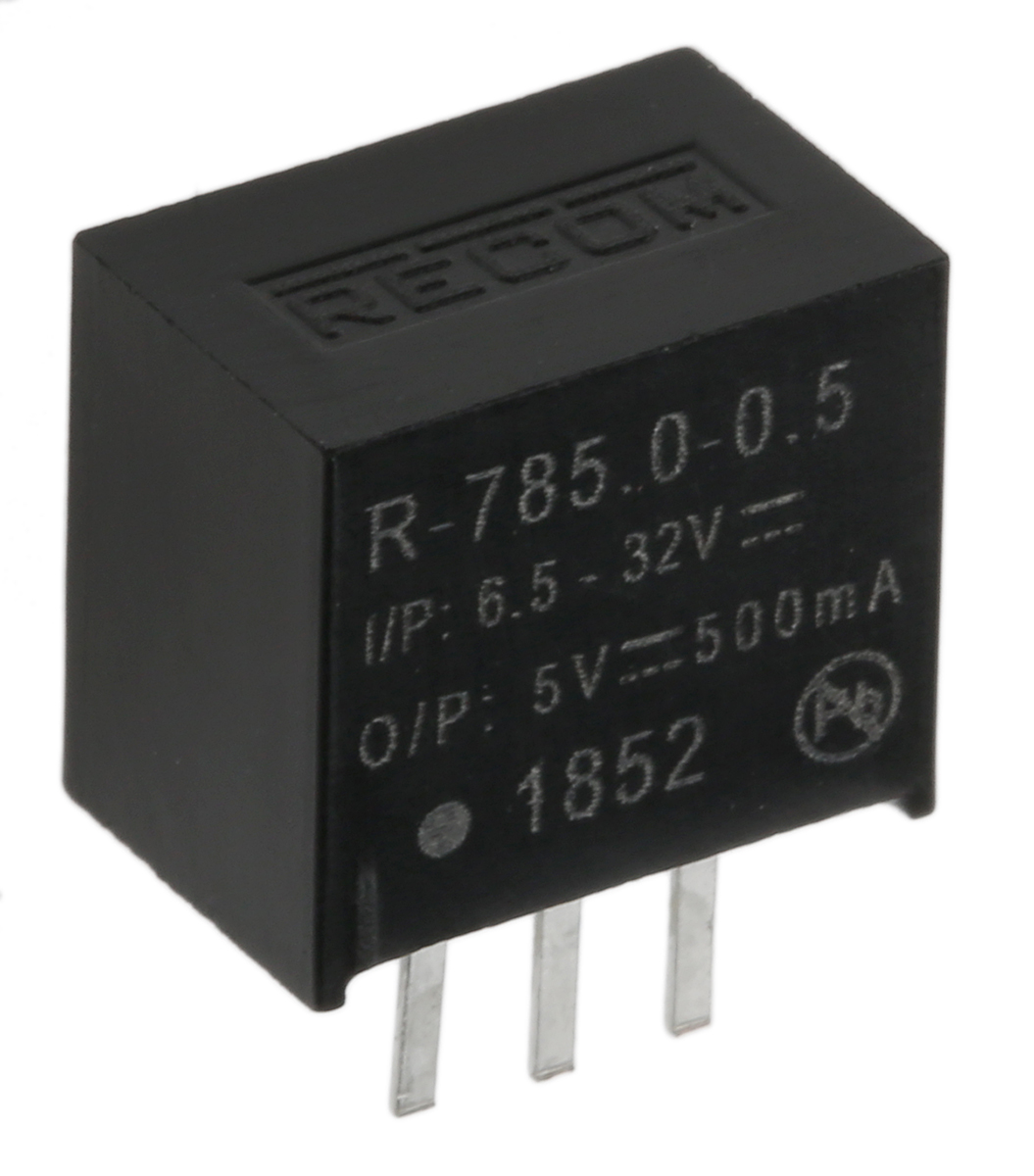 This is Switching Regulator 6.5 → 32V dc Input 5V dc Output 500mA manufactured by Recom. The manufacturer part number is R-785.0-0.5. The product has +85°c maximum temperature. While its minimum temperature is -40°c. Furthermore, the product is 7.55mm wide. The MTBF values include 21098000h. It provides robust protection features, such as short circuit protection. Load Regulation - ±0.6%. It is a highly efficient product with an 94% of high efficiency. Its input voltage is 6.5 → 32v dc. Additionally, the product is supplied with 1 outputs. Has a line regulation of ±0.4%. The product is available in through hole configuration. It is shipped in sip package . Carries 20mv pk-pk ripple and noise. Its accurate length is 11.5mm. In addition, it has dc-dc type power signal conversion . The typical product's weight is 1.9g. It carries 500ma output current. The product r-78-0.5, is a highly preferred choice for users. The product comes in 10.2mm depth. Features a 5v dc output voltage. Feature 2.5w of power rating.