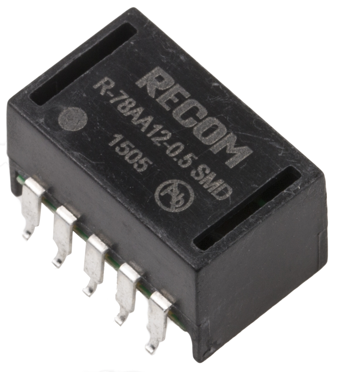 This is Switching Regulator 15 → 32V dc Input 12V dc Output 500mA manufactured by Recom. The manufacturer part number is R-78AA12-0.5SMD. The product has +85°c maximum temperature. While its minimum temperature is -40°c. Furthermore, the product is 9.6mm wide. The MTBF values include 29253000h. It provides robust protection features, such as short circuit protection. The product is available in surface mount configuration. While its maximum input current includes 5ma. Load Regulation - 0.25%. The product complies with all safety standards, such as en60950. It is a highly efficient product with an 97% of high efficiency. Its input voltage is 15 → 32v dc. Its switching frequency range is about 330khz . Additionally, the product is supplied with 1 outputs. Has a line regulation of 0.1%. It is shipped in dip package . Carries 30mv pk-pk ripple and noise. Its accurate length is 15.3mm. The typical product's weight is 2.7g. It carries 500ma output current. Applications Information involves automation, industrial. The product r-78aa-0.5, is a highly preferred choice for users. The product comes in 8.8mm depth. Features a 12v dc output voltage. Feature 6w of power rating.
